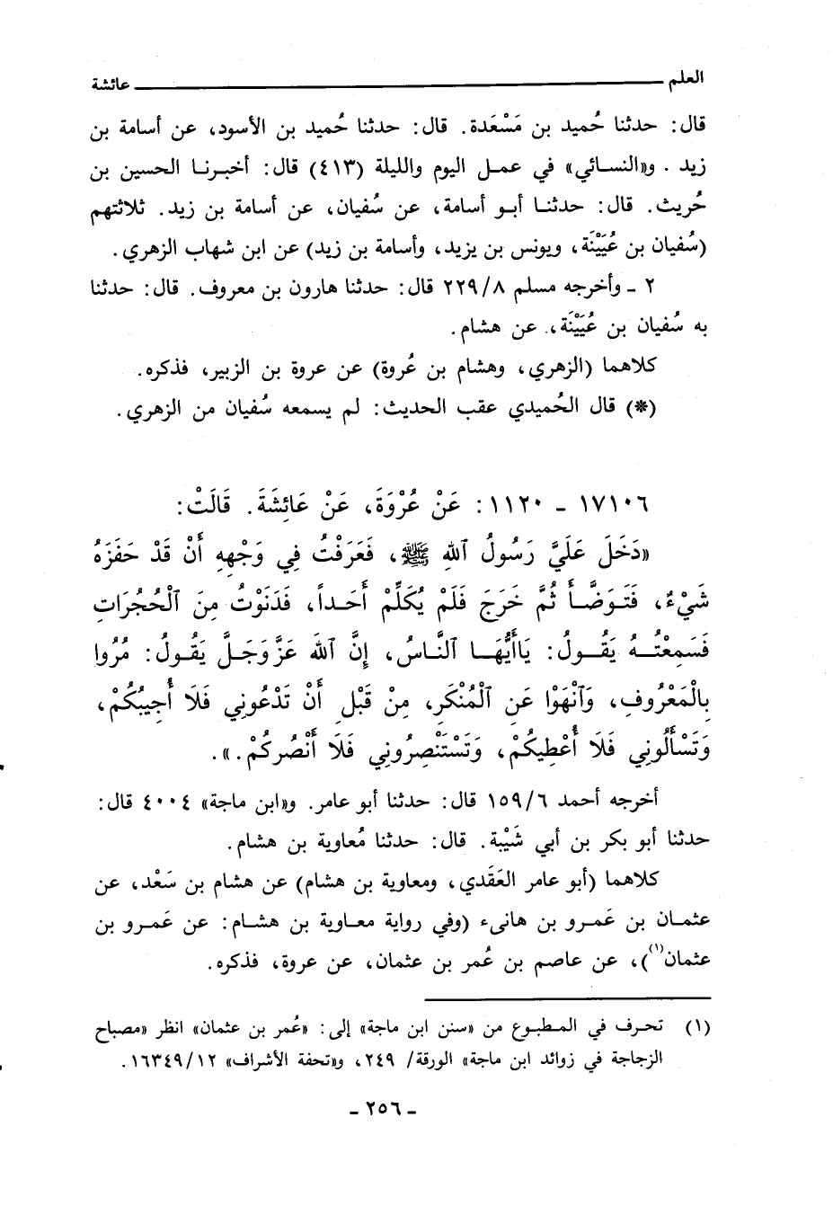 كلاهما (ابوعامر العَقَدي، ومعاوية بن هشام) عن هشام بن سَعْد، عن عثمان بن عَمرو بن هانئ (وفي رواية معاوية بن هشام: عن عَمرو بن عثمان، عن عاصم بن عُمر بن عثمان، عن عروة، فذكره.