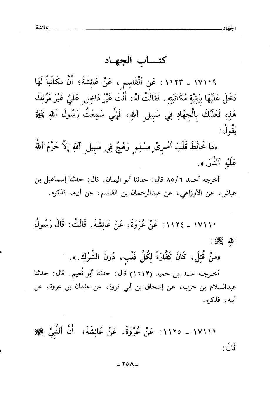 ١٧١٠٩ - عَنِ الْقَاسِمِ، عَنْ عَائِشَةَ؛ أَنَّ مُكَاتَبًا لَهَا دَخَلَ عَلَيْهَا بِبَقِيَّةِ مُكَاتَبَتِهِ. فَقَالَتْ لَهُ: انْتَ غَيْرُ دَاخِلٍ عَلَيَّ غَيْرَ مَرَّتِكَ هَذِهِ فَعَلَيْكَ بِالْجِهَادِ فِي سَبِيلِ اللهِ، فَإِنِّي سَمِعْتُ رَسُولَ اللهِِ صلى الله عليه وسلم يَقُولُ: