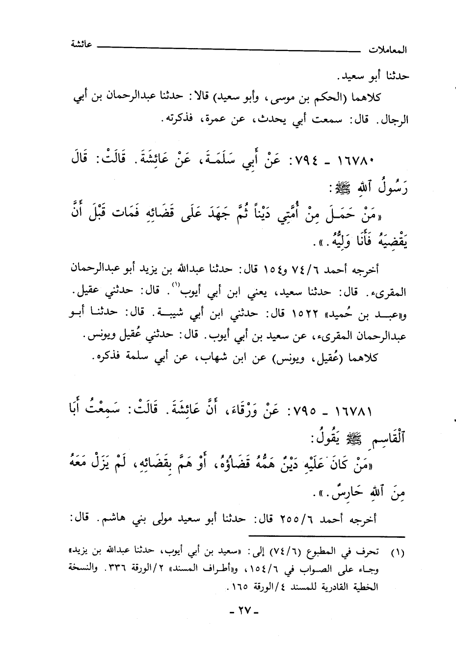 أخرجه أحمد ٦/ ٧٤ و ١٥٤ قال: حدثنا عَبد اللهِ بن يزيد أبو عبد الرحمن المقرئ. قال: حدثنا سعيد، يعني ابن أبي ايوب. قال: حدثني عقيل. وعبد بن حُميد ١٥٢٢ قال: حدثني ابن أبي شيبة. قال: حدثنا أبو عبد الرحمن المقرئ، عن سعيد بن أبي ايوب. قال: حدثني عُقيل ويونس.