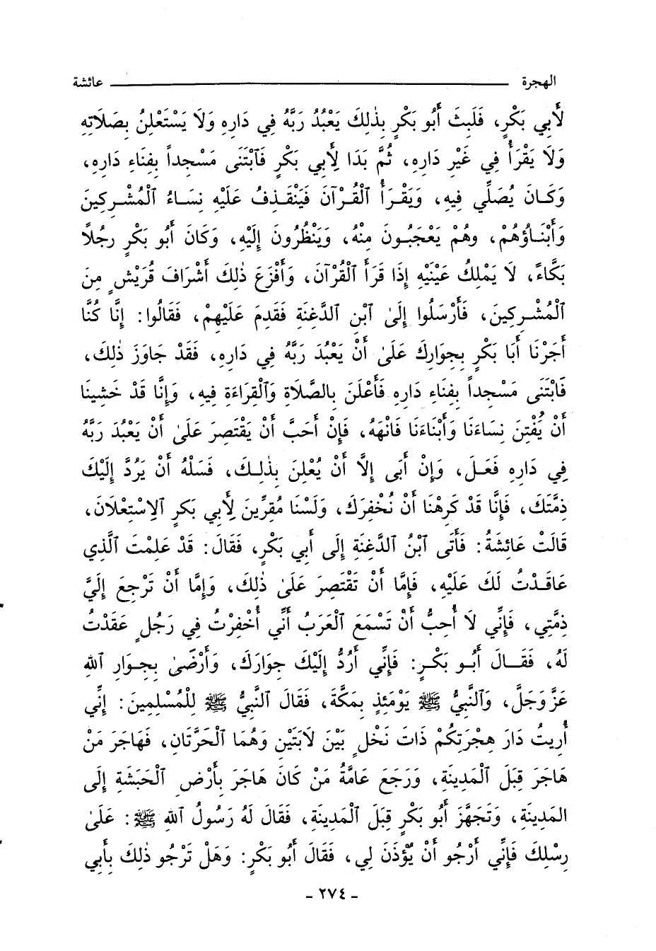، فَلَبِثَ ابُو بَكْرٍ بِذَالِكَ يَعْبُدُ رَبَّهُ فِى دَارِهِ، وَلا يَسْتَعْلِنُ بِصَلاتِهِ، وَلا يَقْرَاُ فِى غَيْرِ دَارِهِ، ثُمَّ بَدَا لابِى بَكْرٍ فَابْتَنَى مَسْجِدًا بِفِنَاءِ دَارِهِ وَكَانَ يُصَلِّى فِيهِ وَيَقْرَاُ الْقُرْانَ، فَيَنْقَذِفُ عَلَيْهِ نِسَاءُ الْمُشْرِكِينَ وَابْنَاؤُهُمْ، وَهُمْ يَعْجَبُونَ مِنْهُ، وَيَنْظُرُونَ إِلَيْهِ، وَكَانَ ابُو بَكْرٍ رَجُلاً بَكَّاءً، لا يَمْلِكُ عَيْنَيْهِ إِذَا قَرَا الْقُرْانَ، وَافْزَعَ ذَالِكَ اشْرَافَ قُرَيْشٍ مِنَ الْمُشْرِكِينَ، فَارْسَلُوا إِلَى ابْنِ الدَّغِنَةِ، فَقَدِمَ عَلَيْهِمْ. فَقَالُوا إِنَّا كُنَّا اجَرْنَا ابَا بَكْرٍ بِجِوَارِكَ، عَلَى أَنْ يَعْبُدَ رَبَّهُ فِى دَارِهِ، فَقَدْ جَاوَزَ ذَالِكَ، فَابْتَنَى مَسْجِدًا بِفِنَاءِ دَارِهِ، فَاعْلَنَ بِالصَّلاةِ وَالْقِرَاءَةِ فِيهِ، وَإِنَّا قَدْ خَشِينَا أَنْ يَفْتِنَ نِسَاءَنَا وَابْنَاءَنَا فَانْهَهُ، فَإِنْ احَبَّ أَنْ يَقْتَصِرَ عَلَى أَنْ يَعْبُدَ رَبَّهُ فِى دَارِهِ فَعَلَ، وَإِنْ ابَى إِلَاّ أَنْ يُعْلِنَ بِذَالِكَ فَسَلْهُ أَنْ يَرُدَّ إِلَيْكَ ذِمَّتَكَ، فَإِنَّا قَدْ كَرِهْنَا أَنْ نُخْفِرَكَ، وَلَسْنَا مُقِرِّينَ لابِى بَكْرٍ الإِسْتِعْلانَ. قَالَتْ عَائِشَةُ فَاتَى ابْنُ الدَّغِنَةِ إِلَى ابِى بَكْرٍ فَقَالَ: قَدْ عَلِمْتَ الَّذِى عَاقَدْتُ لَكَ عَلَيْهِ، فَاُمَّا أَنْ تَقْتَصِرَ عَلَى ذَالِكَ، وَإِمَّا أَنْ تَرْجِعَ إِلَىَّ ذِمَّتِى، فَإِنِّى لا اُحِبُّ أَنْ تَسْمَعَ الْعَرَبُ انِّى اُخْفِرْتُ فِى رَجُلٍ عَقَدْتُ لَهُ. فَقَالَ ابُو بَكْرٍ: فَإِنِّى ارُدُّ إِلَيْكَ جِوَارَكَ وَارْضَى بِجِوَارِ اللهِ عَزَّ وَجَلَّ. وَالنَّبِىُّ صلى الله عليه وسلم يَوْمَئِذٍ بِمَكَّةَ، فَقَالَ النَّبِىُّ صلى الله عليه وسلم