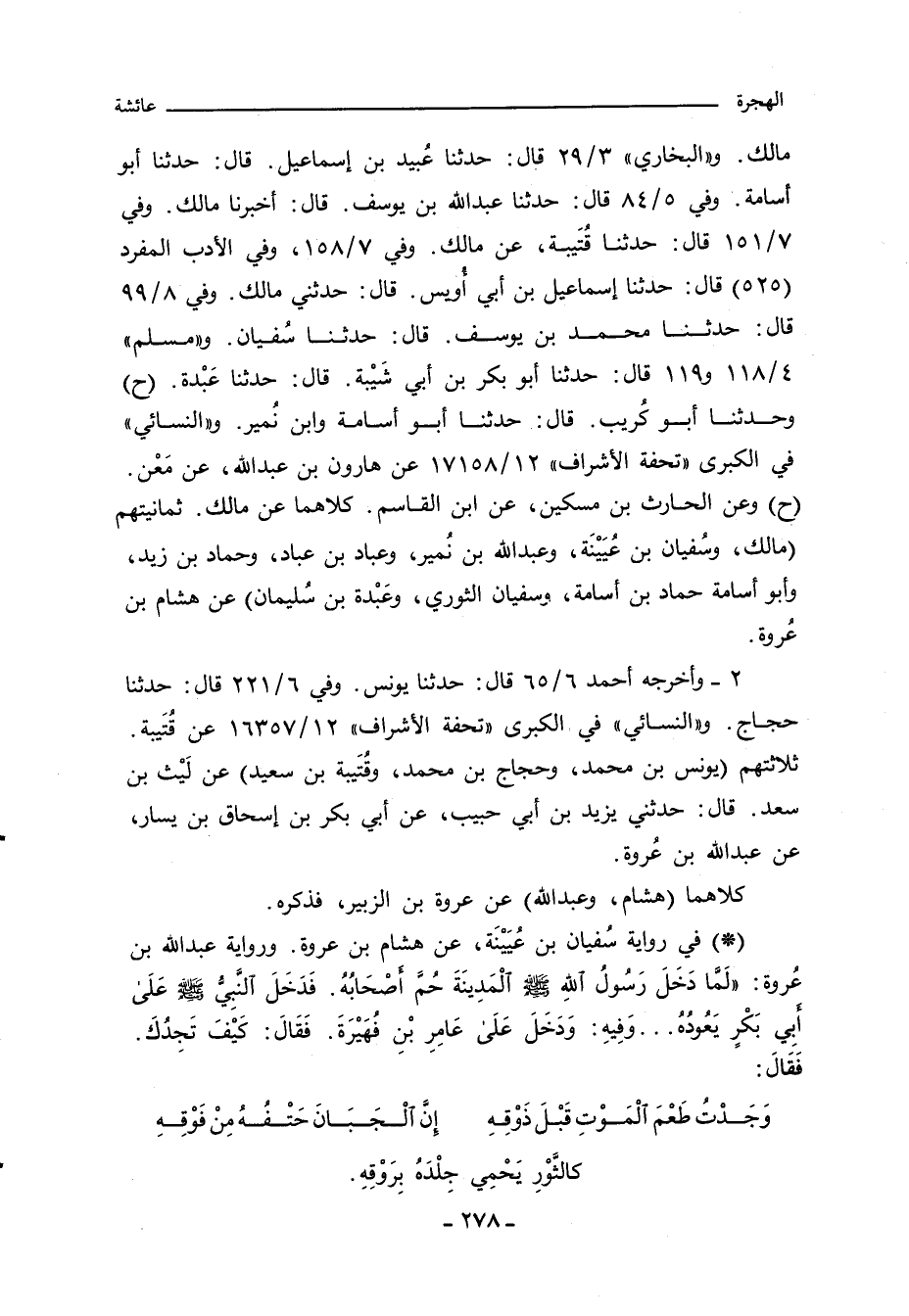 - في رواية سُفيان بن عُيَيْنَة، عن هشام بن عروة. ورواية عبد الله بن عُروة: لَمَّا دَخَلَ رَسُولُ اللهِِ صلى الله عليه وسلم الْمَدينَةَ حُمَّ اصْحَابُهُ. فَدَخَلَ النَبِيُّ صلى الله عليه وسلم عَلَى أبي بَكْرٍ يَعُودُهُ. . . وَفِيهِ: وَدَخَلَ عَلَى عَامِر بْن فُهَيْرَةَ. فَقَالَ: كَيْفَ تَجدُكَ. فَقَالَ: