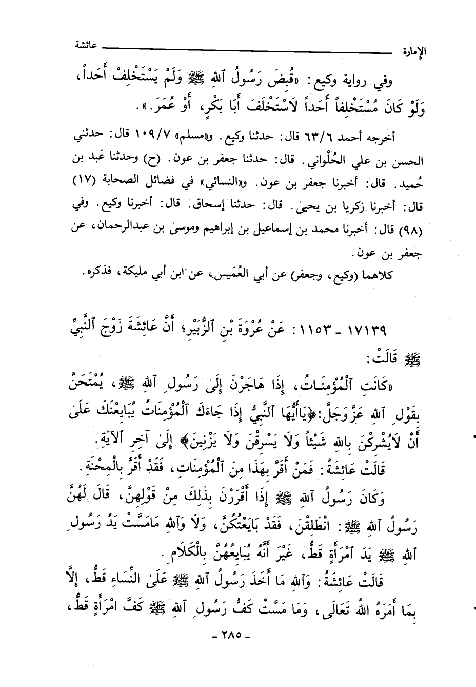 أخرجه أحمد ٦/ ٦٣ قال: حدثنا وكيع. و"مسلم" ٧/ ١٠٩ قال: حدثني الحسن بن علي الحُلْواني. قال: حدثنا جعفر بن عون (ح) وحدثنا عَبد بن حُميد. قال: أخبرنا جعفر بن عون. و"النَّسائي" في فضائل الصحابة (١٧) قال: أخبرنا زكريا بن يحيى. قال: حدثنا إسحاق. قال: أخبرنا وكيع. وفي (٩٨) قال: أخبرنا محمد بن إسماعيل بن إبراهيم وموسى بن عبد الرحمن، عن جعفر بن عون.