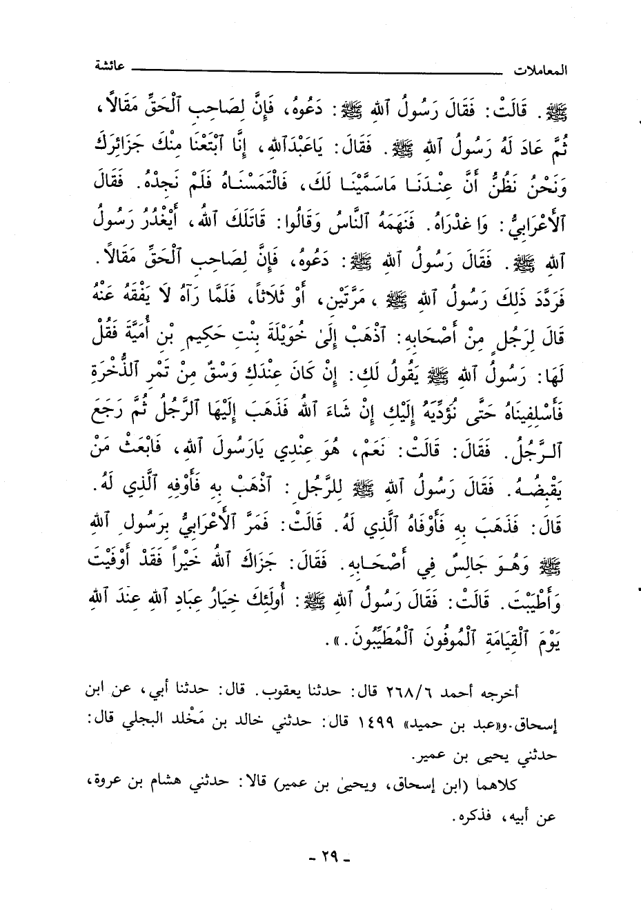 الَيْهَا الرَّجُلُ ثُمَّ رَجَعَ الرَّجُلُ. فَقَالَ: قَالَتْ: نَعَمْ، هُوَ عِنْدِى يَا رَسُولَ اللهِِ، فَابْعَثْ مَنْ يَقْبِضُهُ. فَقَالَ رَسُولُ اللهِِ صلى الله عليه وسلم لِلرَّجُلِ: اذْهَبْ بِهِ فَاوْفِهِ الَّذِى لَهُ. قَالَ: فَذَهَبَ بِهِ فَاوْفَاهُ الَّذِى لَهُ. قَالَتْ: فَمَرَّ الاعْرَابِىُّ بِرَسُولِ اللهِ صلى الله عليه وسلم وَهُوَ جَالِسٌ فِى اصْحَابِهِ. فَقَالَ: جَزَاكَ الله خَيْرا فَقَدْ اوْفَيْتَ وَاطْيَبْتَ. قَالَتْ: فَقَالَ رَسُولُ اللهِِ صلى الله عليه وسلم: اولَئِكَ خِيَارُ عِبَادِ اللهِ عِنْدَ اللهِ يَوْمَ الْقِيَامَةِ الْمُوفُونَ الْمُطِيبُونَ.