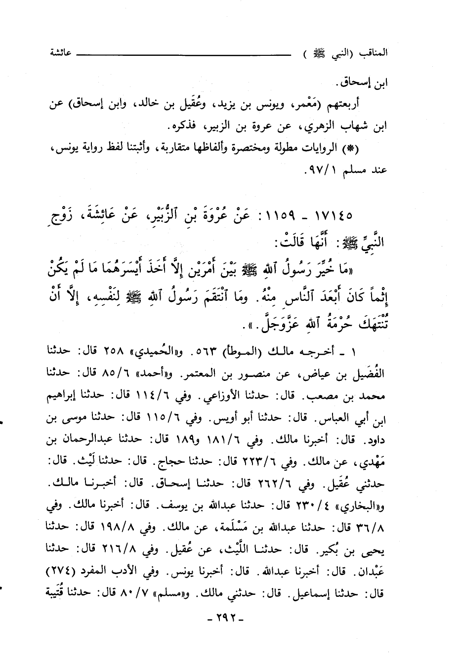 ١ - أخرجه مالك "الموطأ" ٥٦٣. و"الحُمَيدي" ٢٥٨ قال: حدثنا الفُضَيل بن عياض، عن منصور بن المعتمر. و"أحمد" ٦/ ٨٥ قال: حدثنا محمد بن مصعب. قال: حدثنا الاوزاعي. وفي ٦/ ١١٤ قال: حدثنا إبراهيم بن أبي العباس. قال: حدثنا ابو اويس. وفي ٦/ ١١٥ قال: حدثنا موسى بن داود. قال: أخبرنا مالك. وفي ٦/ ١٨١ و ١٨٩ قال: حدثنا عبد الرحمن بن مَهْدي، عن مالك. وفي ٦/ ٢٢٣ قال: حدثنا حجاج. قال: حدثنا لَيْث. قال: حدثتي عُقَيل. وفي ٦/ ٢٦٢ قال: حدثنا إسحاق. قال: أخبرنا مالك. و"البُخَارِي" ٤/ ٢٣٠ قال: حدثنا عبد الله بن يوسف. قال: أخبرنا مالك. وفي ٨/ ٣٦ قال: حدثنا عبد الله بن مَسْلَمة، عن مالك. وفي ٨/ ١٩٨ قال: حدثنا يحيى بن بُكير. قال: حدثنا الليْث، عن عُقيل. وفي ٨/ ٢١٦ قال: حدثنا عَبْدان. قال: أخبرنا عبد الله. قال: أخبرنا يونس. وفي (الأدب المفرد) (٢٧٤) قال: حدثنا إسماعيل. قال: حدثني مالك. و"مسلم" ٧/ ٨٠ قال: حدثنا قُتَيبة