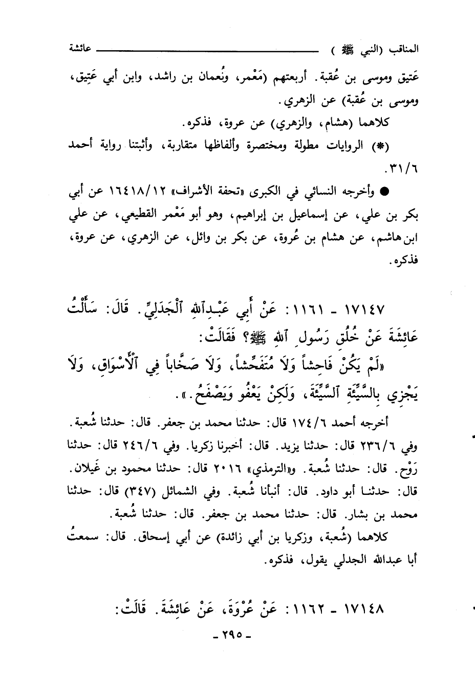 أخرجه أحمد ٦/ ١٧٤ قال: حدثنا محمد بن جعفر. قال: حدثنا شُعبة. وفي ٦/ ٢٣٦ قال: حدثنا يزيد. قال: أخبرنا زَكريا. وفي ٦/ ٢٤٦ قال: حدثنا رَوْح. قال: حدثنا شُعبة. و"التِّرمِذي" ٢٠١٦ قال: حدثنا محمود بن غَيلان. قال: حدثنا ابو داود. قال: أنبانا شُعبة. وفيِِ الشمائل (٣٤٧) قال: حدثنا محمد بن بشار. قال: حدثنا محمد بن جعفر. قال: حدثنا شُعبة.