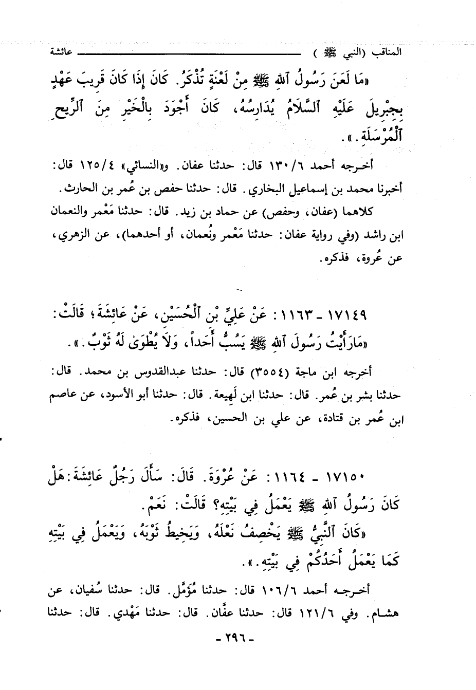 مَا لَعَنَ رَسُولُ اللهِِ صلى الله عليه وسلم مِنْ لَعْنَةٍ تُذْكَرُ. كَانَ إِذَا كَانَ قَرِيبَ عَهْدٍ بجِبْرِيلَ عَلَيْهِ السَّلامُ يُدَارِسُهُ، كانَ اجْوَدَ بِالْخَيْرِ مِنَ الرِّيح الْمُرْسَلَةِ.