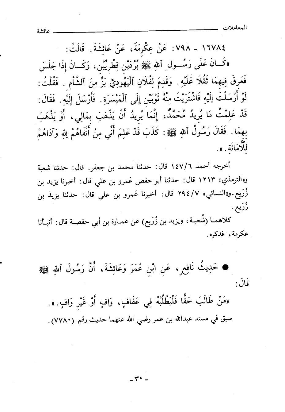 كَانَ عَلَى رَسُولِ الله صلى الله عليه وسلم بُرْدَيْنِ قِطْرِيِّيْنِ، وَكَانَ اذَا جَلَسَ فَعَرقَ فِيهِمَا ثَقُلا عَلَيْهِ. وَقَدِمَ لِفُلانٍ الْيَهُودِيِّ بَزٌّ مِنَ الشَّامِ. فَقُلْتُ: لَوْ ارْسَلْتَ الَيْهِ فَاشْتَرَيْتَ مِنْهُ ثَوْبَيْنِ الَى الْمَيْسَرَةِ. فَارْسَلَ الَيْهِ. فَقالَ: قَدْ عَلِمْتُ مَا يُرِيدُ مُحَمَّد، انَّمَا يُرِيدُ انْ يَذْهَبَ بِمَالِي، اوْ يَذْهَبَ بِهمَا. فَقَالَ رَسُولُ اللهِ صلى الله عليه وسلم: كَذَبَ قَدْ عَلِمَ انِّي مِنْ اتْقَاهُمْ لِلّهِ وَادَاهُمْ لِلامَانَةِ.