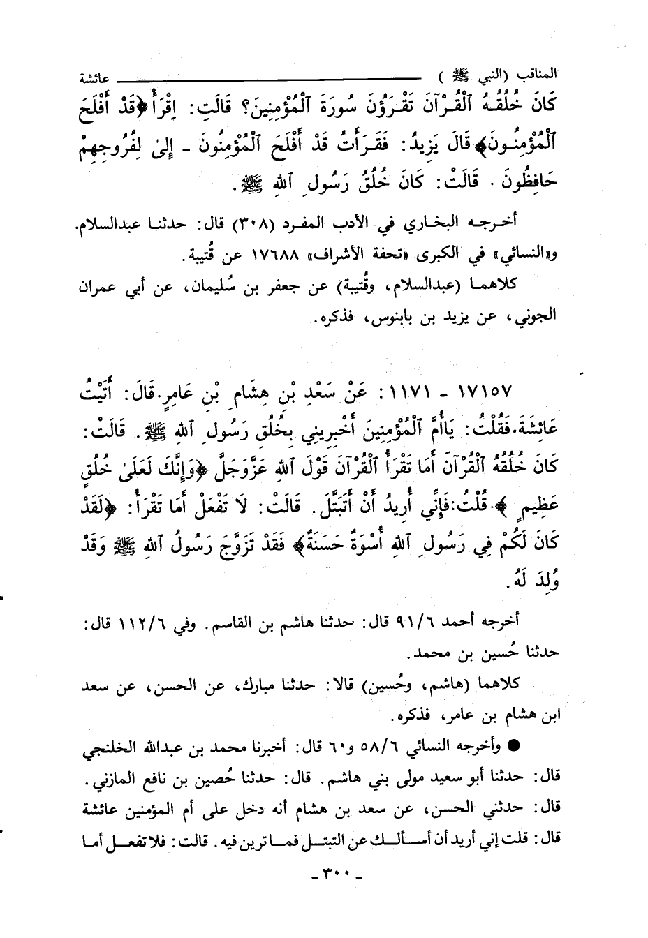 كَانَ خُلُقُهُ الْقُرْانَ تَقْرَؤُنَ سُورَةَ الْمُؤْمِنِينَ؟ قَالَتِ: إِقْرَاْ: (قَدْ افْلَحَ الْمُؤْمِنُونَ) قَالَ يَزِيدُ: فَقَرَاْتُ: قَدْ افْلَحَ الْمُؤْمِنُونَ - إِلَى: لِفُرُوجِهِمْ حَافِظُونَ. قَالَتْ: كَانَ خُلُقُ رَسُولِ اللَّهِ صلى الله عليه وسلم.