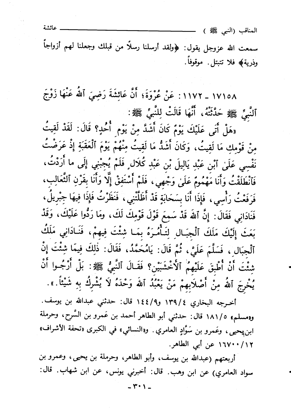 هَلْ اتَى عَلَيْكَ يَوْمٌ كَانَ اشَدَّ مِنْ يَوْمِ اُحُدٍ؟ قَالَ: لَقَدْ لَقِيتُ مِنْ قَوْمِكِ مَا لَقِيتُ، وَكَانَ اشَدُّ مَا لَقِيتُ مِنْهُمْ يَوْمَ الْعَقَبَةِ إِذْ عَرَضْتُ نَفْسِي عَلَى ابْنِ عَبْدِ يَالِيلَ بْنِ عَبْدِ كُلالٍ فَلَمْ يُجِبْنِي إِلَى ما ارَدْتُ، فَانْطَلَقْتُ وَانَا مَهْمُومٌ عَلَى وَجْهِي، فَلَمْ اسْتَفِقْ إِلَاّ وَانَا بِقَرْنِ الثَّعَالِبِ، فَرَفَعْتُ رَاْسِي، فَإِذَا انَا بِسَحَابَةٍ قَدْ اظَلَّتْنِي، فَنَظَرْتُ فَإِذَا فِيهَا جِبْرِيلُ، فَنَادَانِي فَقَالَ: إِنَّ اللَّهَ قَدْ سَمعَ قَوْلَ قَوْمِكَ لَكَ، ومَا رَدُّوا عَلَيْكَ، وَقَدْ بَعَثَ إِلَيْكَ مَلَكَ الْجِبَالِ لِتَاْمُرَهُ بِمَا شِئْتَ فِيهِمْ، فَنَادَانِي مَلَكُ الْجِبَالِ، فَسَلَّمَ عَلَيَّ، ثُمَّ قَالَ: يَامُحَمَّدُ، فَقَالَ: ذَالِكَ فِيمَا شِئْتَ إِنْ شِئْتَ أَنْ اطْبِقَ عَلَيْهِمُ الاخْشَبَيْنِ؟ فَقَالَ النَّبيُّ صلى الله عليه وسلم: بَلْ ارْجُوا أَنْ يُخْرِجَ اللَّهُ مِنْ اصْلابِهِمْ مَنْ يَعْبُدُ اللَّهَ وَحْدَهُ لا يُشْرِكُ بِهِ شَيْئًا.