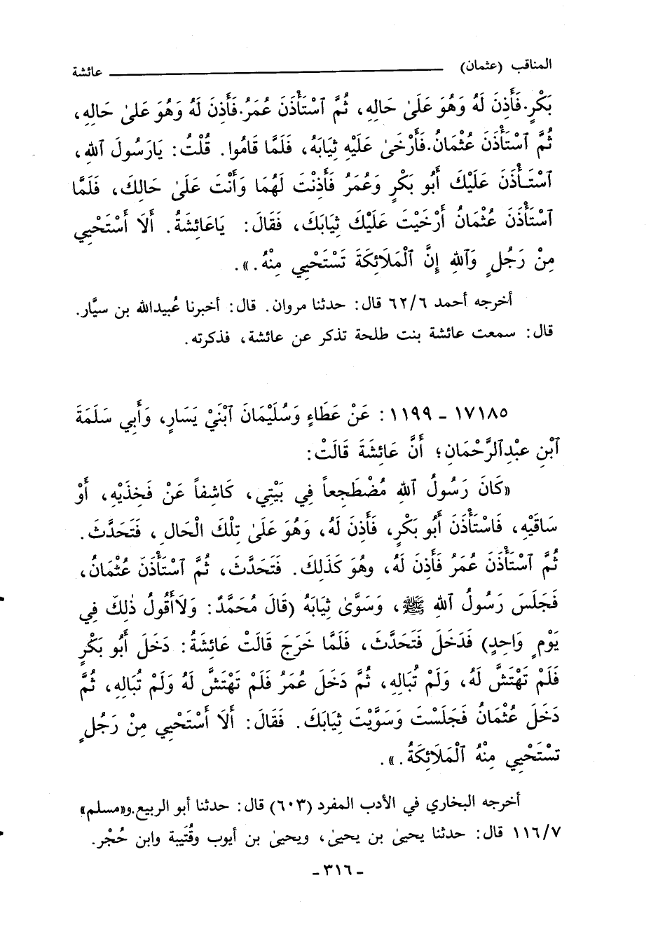 كَانَ رَسُولُ اللَّهِ مُضْطَجِعًا فِي بَيْتِي، كَاشِفًا عَنْ فَخِذَيْهِ، اوْ سَاقَيْهِ، فَاسْتَاْذَنَ ابُو بَكْرٍ، فَاذِنَ لَهُ، وَهُوَ عَلَى تِلْكَ الْحَالِ، فَتَحَدَّثَ. ثُمَّ اسْتَاْذَنَ عُمَرُ فَاذِنَ لَهُ، وهُوَ كَذَالِكَ. فَتَحَدَّثَ، ثُمَّ اسْتَاْذَنَ عُثْمَانُ، فَجَلَسَ رَسُولُ اللَّهِ صلى الله عليه وسلم، وَسَوَّى ثِيَابَهُ (قَالَ مُحَمَّدٌ: وَلا اقًولُ ذَالِكَ فِي يَوْمٍ وَاحِدٍ) فَدَخَلَ فَتَحَدَّثَ، فَلَمَّا خَرَجَ قَالَتْ عَائِشَةُ: دَخَلَ ابُو بَكْرٍ فَلَمْ تَهْتَشَّ لَهُ، وَلَمْ تبَالِهِ، ثُمَّ دَخَلَ عُمَرُ فَلَمْ تَهْتَشَّ لَهُ وَلَمْ تُبَالِهِ، ثُمَّ دَخَلَ عُثْمَانُ فَجَلَسْتَ وَسَوَّيْتَ ثِيَابَكَ. فَقَالَ: الا اسْتَحِْيي مِنْ رَجُلٍ تسْتَحْييِ مِنْهُ الْمَلائِكَةُ.