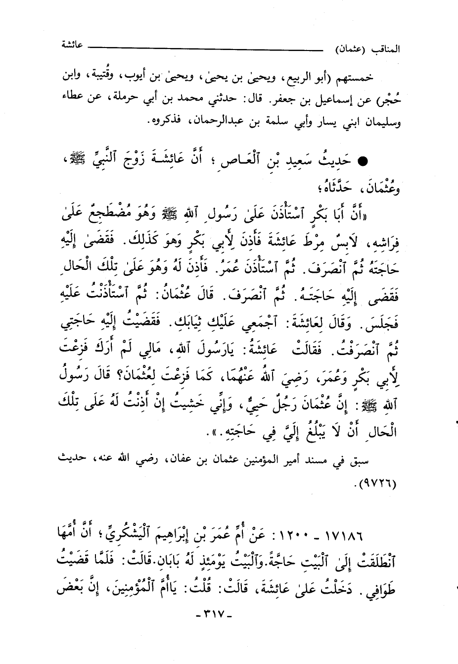 - حَدِيثُ سَعِيدِ بْنِ الْعَاصِ؛ أَنَّ عَائِشَةَ زَوْجَ النَّبيِّ صلى الله عليه وسلم، وعُثْمَانَ، حَدَّثَاهُ؛