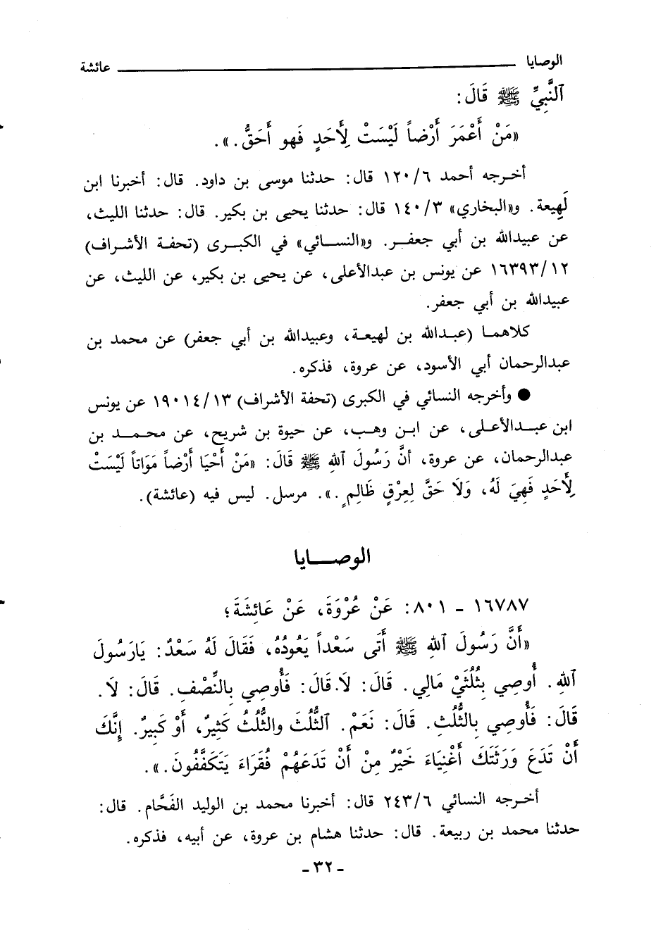أَنَّ رَسُولَ اللهِ صلى الله عليه وسلم اتَى سَعْدا يَعُودُهُ، فَقَالَ لَهُ سَعْدٌ: يَارَسُولَ اللهِ. اوصِي بِثُلُثَيْ مَالِي. قَالَ: لا. قَالَ: فَاوصِي بِالنِّصْفِ. قَالَ: لا. قَالَ: فَاوصِي بِالثُّلُثِ. قَالَ: نَعَمْ. الثُّلُثَ والثُّلُثُ كَثِيرٌ، اوْ كَبِيرٌ. انَّكَ انْ تَدَعَ وَرَثَتَكَ اغْنِيَاءَ خَيْرٌ مِنْ انْ تَدَعَهُمْ فُقَرَاءَ يَتَكَفَّفُونَ.