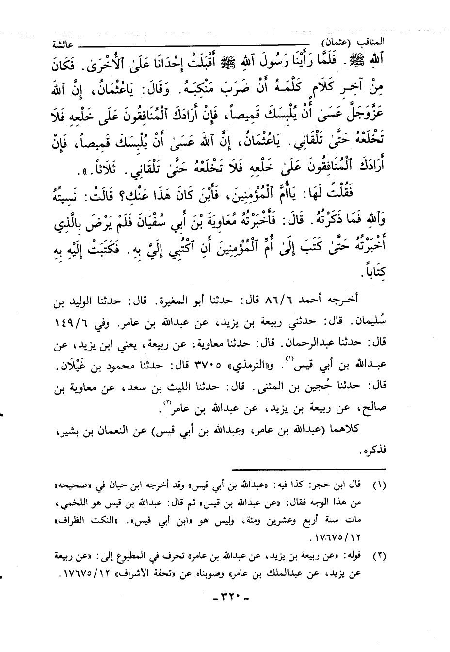 أخرجه أحمد ٦/ ٨٦ قال: حدثنا ابو المغيرة. قال: حدثنا الوليد بن سُليمان. قال: حدثني ربيعة بن يزيد، عن عبد الله بن عامر. وفي ٦/ ١٤٩ قال: حدثنا عبد الرحمن. قال: حدثنا معاوبة، عن ربيعة، يعني ابن يزيد، عن عبد الله بن أبي قيس. و"التِّرمِذي" ٣٧٠٥ قال: حدثنا محمود بن غَيْلان. قال: حدثنا حُجين بن المثنى. قال: حدثنا الليث بن سعد، عن معاوية بن صالح، عن ربيعة بن يزيد، عن عبد الله بن عامر.