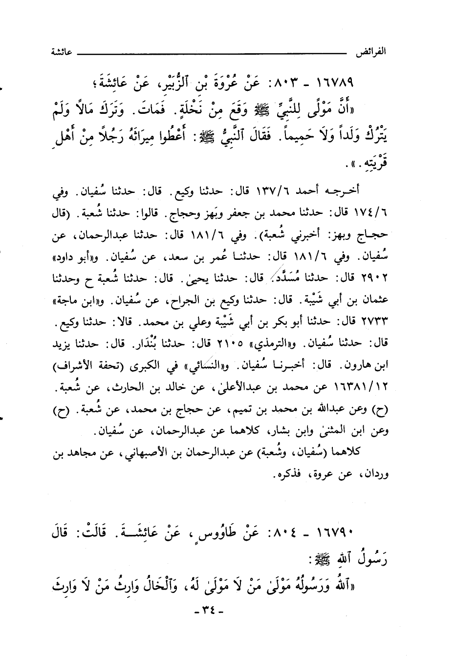 أخرجه أحمد ٦/ ١٣٧ قال: حدثنا وكيع. قال: حدثنا سُفيان. وفي ٦/ ١٧٤ قال: حدثنا محمد بن جعفر وبَهز وحجاج. قالوا: حدثنا شُعبة (قال حجاج وبهز: أخبرني شُعبة). وفي ٦/ ١٨١ قال: حدثنا عبد الرحمن، عن سُفيان. وفي ٦/ ١٨١ قال: حدثنا عُمر بن سعد، عن سُفيان. و"أبو داود" ٢٩٠٢ قال: حدثنا مُسَدَّد. قال: حدثنا يحيى. قال: حدثنا شُعبة ح وحدثنا عثمان بن أبي شَيْبة. قال: حدثنا وكيع بن الجراح، عن سُفيان. و"ابن ماجة" ٢٧٣٣ قال: حدثنا أبو بكر بن أبي شَيْبة وعلي بن محمد. قالا: حدثنا وكيع. قال: حدثنا سُفيان. و"التِّرمِذي" ٢١٠٥ قال: حدثنا بُنْدَار. قال: حدثنا بزيد بن هارون. قال: أخبرنا سُفيان. و"النَّسائي" في "الكبرى" (تحفة الاشراف) ١٢/ ١٦٣٨١ عن محمد بن عبد الاعلى، عن خالد بن الحارث، عن شُعبة (ح) وعن عَبد اللهِ بن محمد بن تميم، عن حجاج بن محمد، عن شُعبة (ح) وعن ابن المثنى وابن بشار، كلاهما عن عبد الرحمن، عن سُفيان.