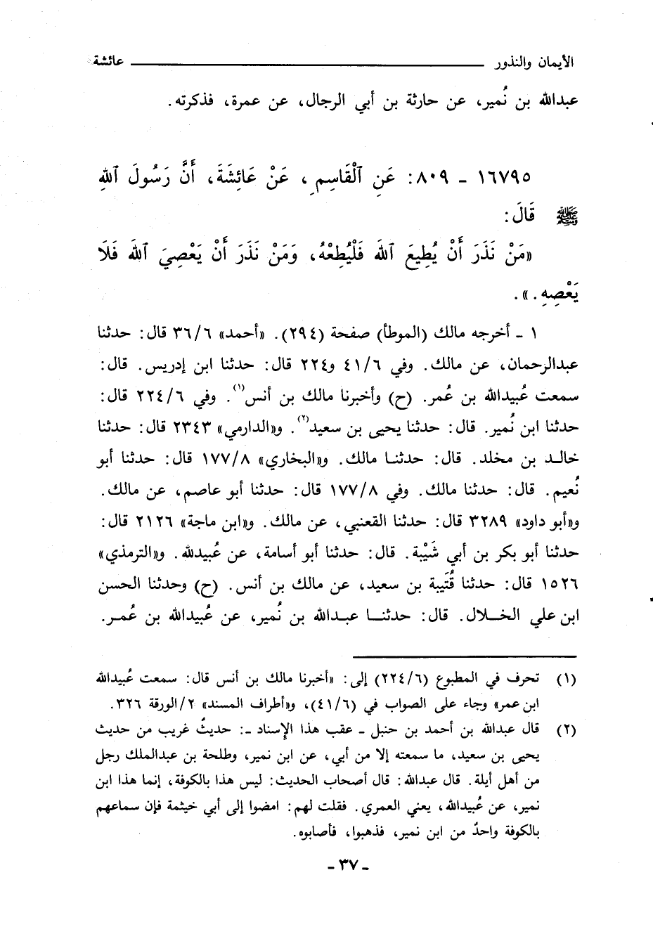 ١ - أخرجه مالك "الموطأ" صفحة (٢٩٤). و"أحمد" ٦/ ٣٦ قال: حدثنا عبد الرحمن، عن مالك. وفي ٦/ ٤١ و ٢٢٤ قال: حدثنا ابن ادريس. قال: سمعت عبيد الله بن عُمر (ح) واخبرنا مالك بن انس. وفي ٦/ ٢٢٤ قال: حدثنا ابن نُمير. قال: حدثنا يحيى بن سعيد. و"الدارِمِي" ٢٣٤٣ قال: حدثنا خالد بن مخلد. قال: حدثنا مالك. و"البُخَارِي" ٨/ ١٧٧ قال: حدثنا أبو نُعيم. قال: حدثنا مالك. وفي ٨/ ١٧٧ قال: حدثنا أبو عاصم، عن مالك. و"أبو داود" ٣٢٨٩ قال: حدثنا القعنبي، عن مالك. و"ابن ماجة" ٢١٢٦ قال: حدثنا أبو بكر بن أبي شَيْبة. قال: حدثنا أبو أُسامة، عن عُبيد اللهّ. و"التِّرمِذي" ١٥٢٦ قال: حدثنا قُتَيبة بن سعيد، عن مالك بن انس (ح) وحدثنا الحسن بن علي الخلال. قال: حدثنا عبد الله بن نُمير، عن عبيد اللهّ بن عُمر.
