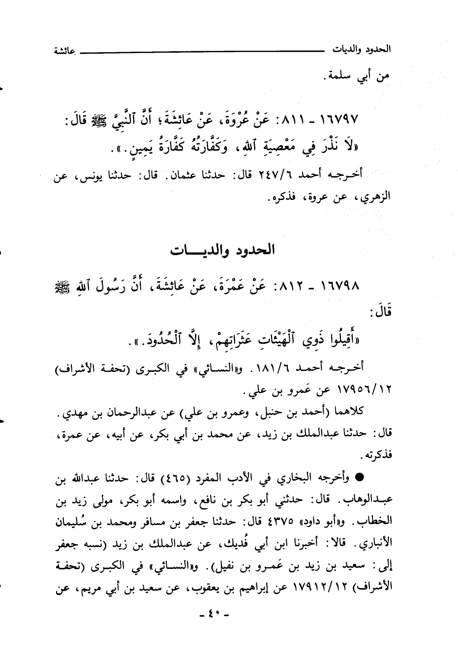١٦٧٩٨ - عَنْ عَمْرَةَ، عَنْ عَائِشَةَ، أَنَّ رَسُولَ اللهِِ صلى الله عليه وسلم: