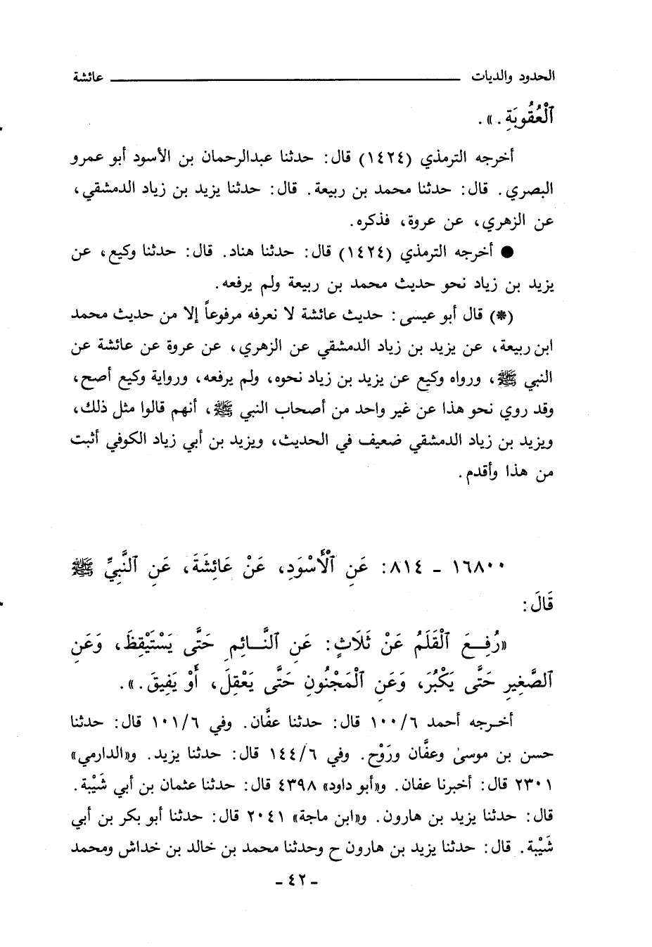 رُفِعَ الْقَلَمُ عَنْ ثَلاثٍ: عَنِ النَّائِمِ حَتَّى يَسْتَيْقِظَ، وَعَنِ الصَّغِيرِ حَتَّى يَكْبُرَ، وَعَنِ الْمَجْنُونِ حَتَّى يَعْقِلَ اوْ يَفِيقَ.