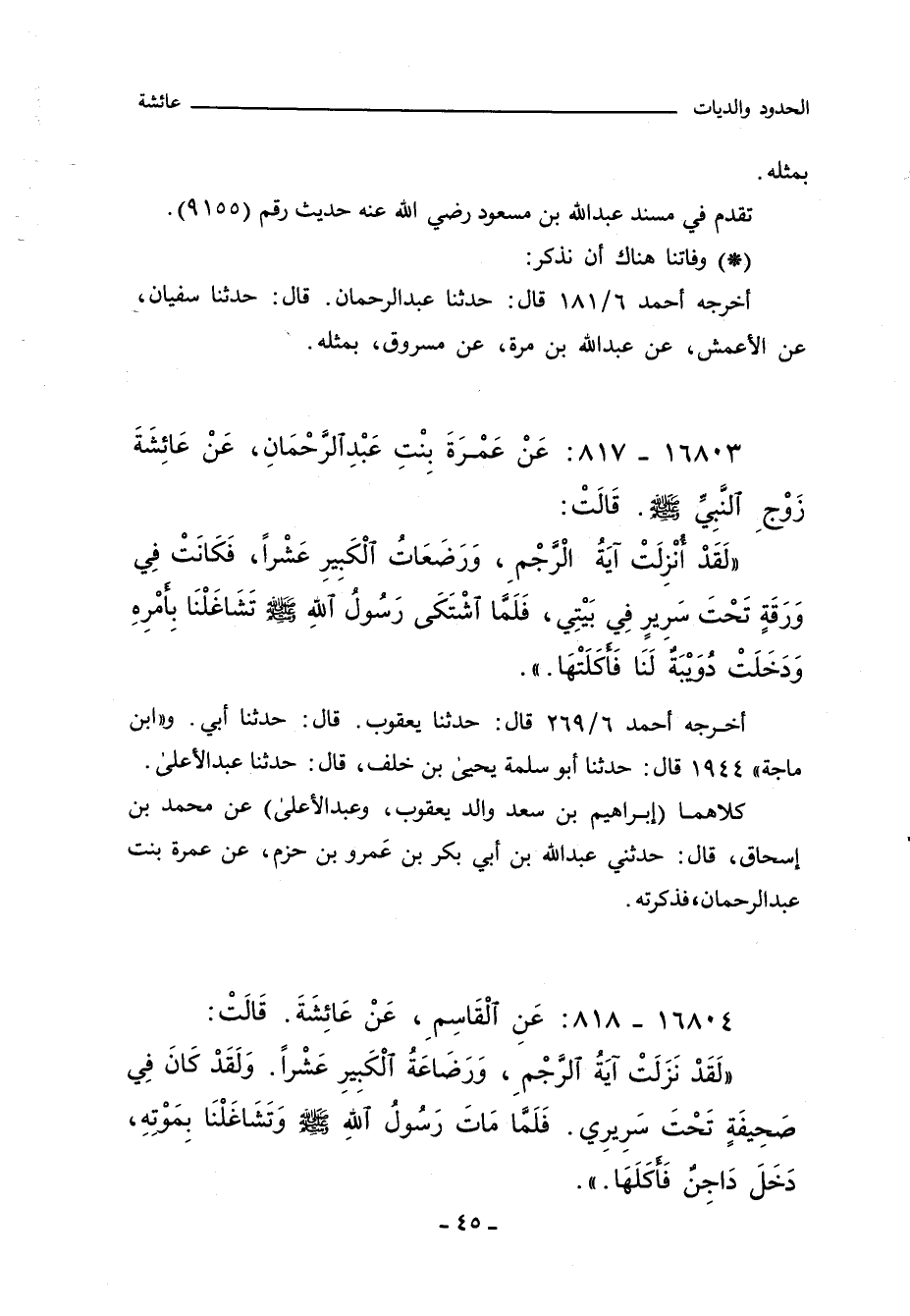 ١٦٨٠٣ - عَنْ عَمْرَةَ بنْتِ عَبْدِ الرَّحْمانِ، عَنْ عَائِشَةَ زَوْجِ النَّبِيِّ صلى الله عليه وسلم. قَالَتْ:
