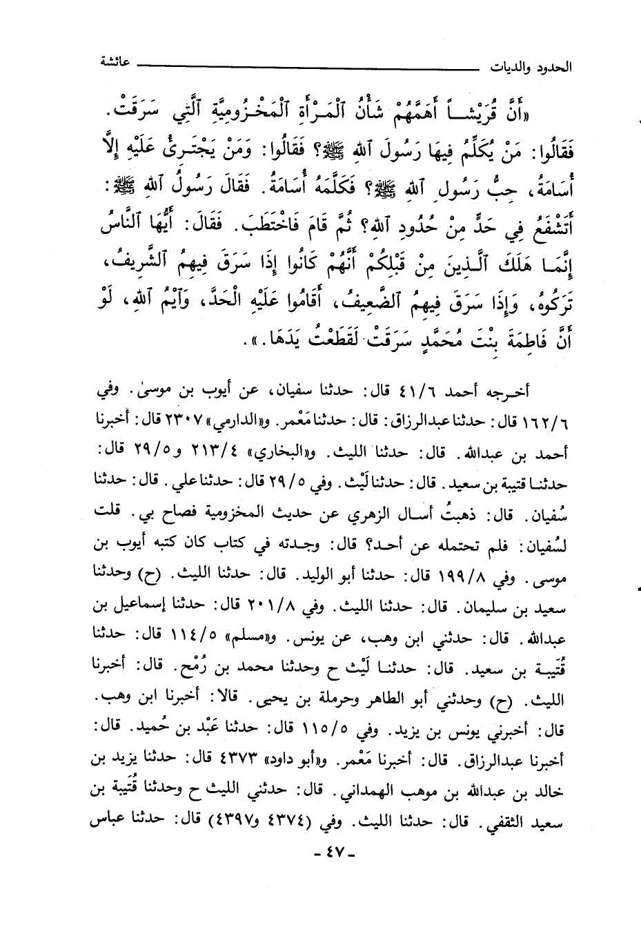 انَّ قُرَيْشا اهَمَّهُمْ شَانُ الْمَرْاةِ الْمَخْزُومِيَّةِ الَّتِى سَرَقَتْ. فَقَالُوا: مَنْ يُكَلِّمُ فِيهَا رَسُولَ اللهِِ صلى الله عليه وسلم؟ فَقَالُوا: وَمَنْ يَجْتَرِئُ عَلَيْهِ الا أُسامة، حِبُّ رَسُولِ اللهِ صلى الله عليه وسلم. فَكَلَّمَهُ أُسامة. فَقَالَ رَسُولُ اللهِِ صلى الله عليه وسلم: اتَشْفَعُ فِى حَدٍّ مِنْ حُدُودِ اللهِ؟ ثُمَّ قَامَ فَاخْتَطَبَ. فَقَالَ: أَيُّهَا النَّاسُ انَّمَا هْلَكَ الَّذِينَ قَبْلَكُمْ انَّهُمْ كَانُوا اذَا سَرَقَ فِيهِمُ الشَّرِيفُ، تَرَكُوهُ وَاذَا سَرَقَ فِيهِمُ الضَّعِيفُ، اقَامُوا عَلَيْهِ الْحَدَّ، وَايْمُ اللهِ، لَوْ انَّ فَاطِمَةَ بِنْتَ مُحَمَّدٍ سَرَقَتْ لَقَطَعْتُ يَدَهَا.