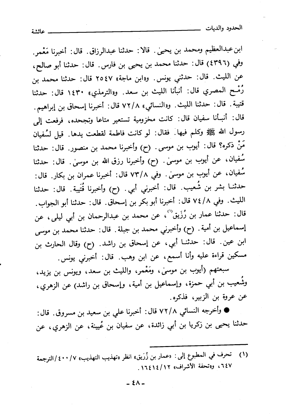 ابن عبد العظيم ومحمد بن يحيى. قالا: حدثنا عبد الرزاق. قال: أخبرنا مَعْمر. وفي (٤٣٩٦) قال: حدثنا محمد بن يحيى بن فارس. قال: حدثنا أبو صالح، عن الليث. قال: حدثني يونس. و"ابن ماجة" ٢٥٤٧ قال: حدثنا محمد بن رُمْح المصري قال: أنبانا الليث بن سعد. و"التِّرمِذي" ١٤٣٠ قال: حدثنا قتيبة. قال: حدثنا الليث. و"النَّسائي" ٨/ ٧٢ قال: أخبرنا إسحاق بن إبراهيم. قال: أنبانا سفيان قال: كانت مخزومية تستعير متاعا وتجحده، فرفعت الى رسول الله صلى الله عليه وسلم كلم فيها. فقال: لو كانت فاطمة لقطعت يدها. قيل لسفيان مَنْ ذكره