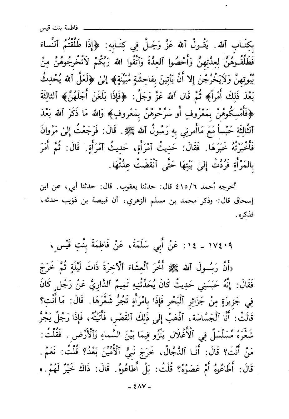 أَنَّ رَسُولَ اللهِِ صلى الله عليه وسلم اخَّرَ الْعِشَاءَ الاخِرَةَ ذَاتَ لَيْلَةٍ ثُمَّ خَرَجَ فَقَالَ: إِنَّهُ حَبَسَنِى حَدِيثٌ كَانَ يُحَدِّثُنِيهِ تَمِيمٌ الدَّارِىُّ عَنْ رَجُلٍ كَانَ فِى جَزِيرَةٍ مِنْ جَزَائِرِ الْبَحْرِ فَإِذَا انَا بِامْرَاةٍ تَجُرُّ شَعْرَهَا، قال: مَا انْتِ قَالَتْ: انَا الْجَسَّاسَةُ، اذْهَبْ إِلَى ذَالِكَ الْقَصْرِ، فَاتَيْتُهُ، فَإِذَا رَجُلٌ يَجُرُّ شَعْرَهُ مُسَلْسَلٌ فِى الاغْلالِ يَنْزُو فِيمَا بَيْنَ السَّمَاءِ وَالارْضِ. فَقُلْتُ: مَنْ انْتَ؟ قَالَ: انَا الدَّجَّالُ، خَرَجَ نَبِىُّ الاُمِّيِّينَ بَعْدُ؟ قُلْتُ: نَعَمْ، قال: اطَاعُوهُ أم عَصَوْهُ؟ قُلْتُ: بَلْ اطَاعُوهُ، قال: ذَاكَ خَيْرٌ لَهُمْ.