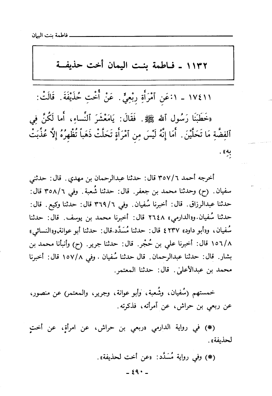 - في رواية الدارمي: ربعي بن حراش، لحذيفة. عن امرأةٍ، عن اختٍ لحذيفة.