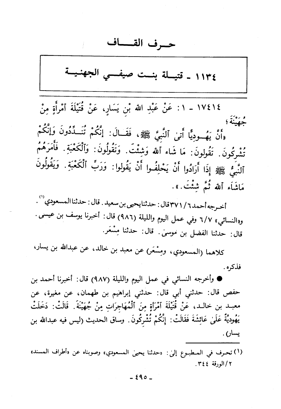 - وأخرجه النسائي في عمل اليوم والليلة (٩٨٧) قال: أخبرنا أحمد بن حفص قال: حدثني أبي قال: حدثني إبراهيم بن طهمان، عن مغيرة، عن معبد بن خالد، عَنْ قُتَيْلَةَ امْرَاةٍ مِنَ الْمُهَاجِرَاتِ مِنْ جُهَيْنَةَ. قَالَتْ: دَخَلَتْ يَهُوديًةٌ عَلَى عَائِشَةَ فَقَالَتْ: إِنَكُمْ تُشْرِكُونَ. وساق الحديث (ليس فيه عبد الله بن يسار.