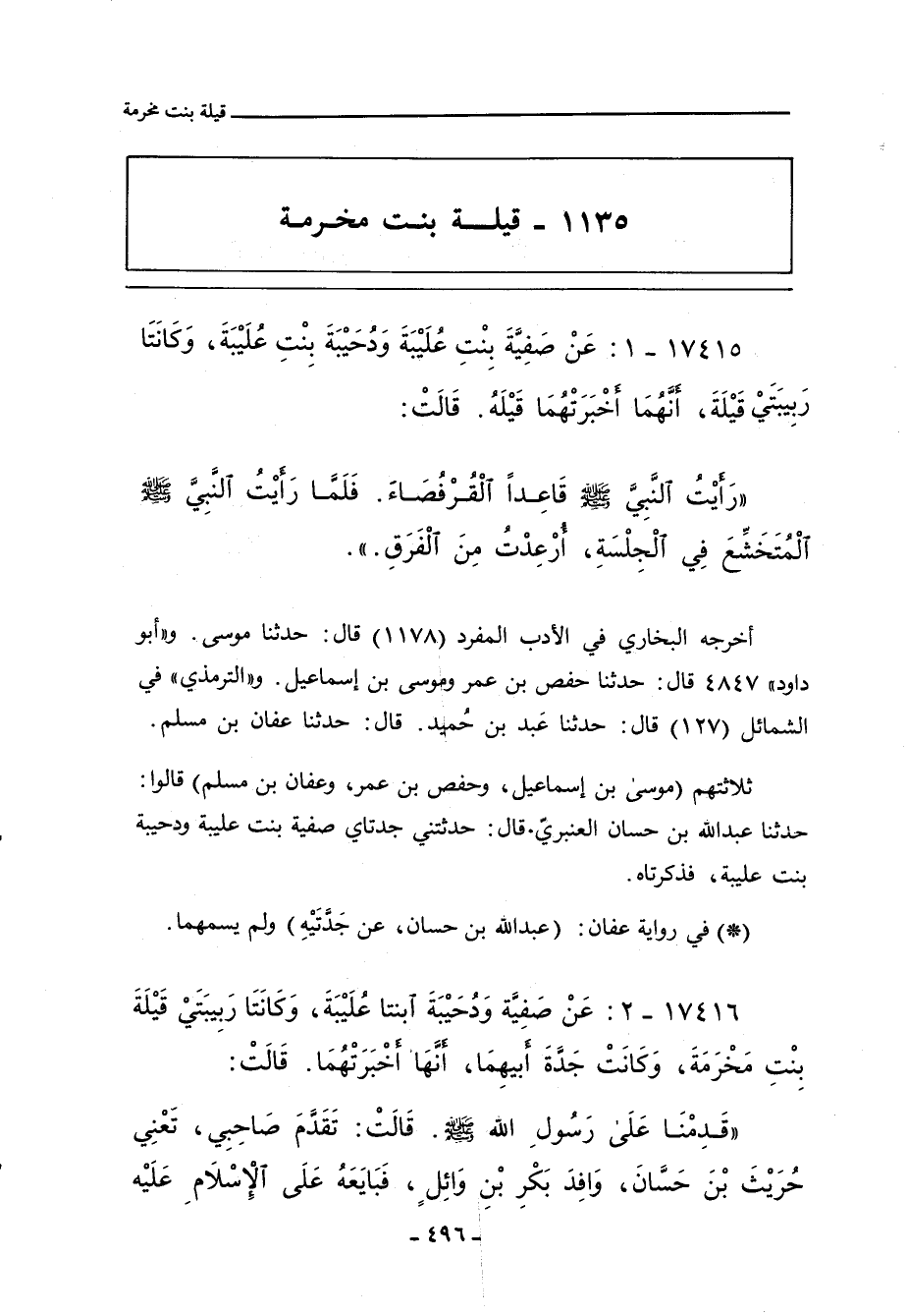 ١٧٤١٥ - عَنْ صَفِيَّةَ بِنْتِ عُلَيْبَةَ وَدُحَيْبَةَ بِنْتِ عُلَيْبَةَ، وَكَانَتَا رَبِيبَتَيْ قَيْلَةَ، انَّهُمَا اخْبَرَتْهُمَا قَيْلَهُ. قَالَتْ: