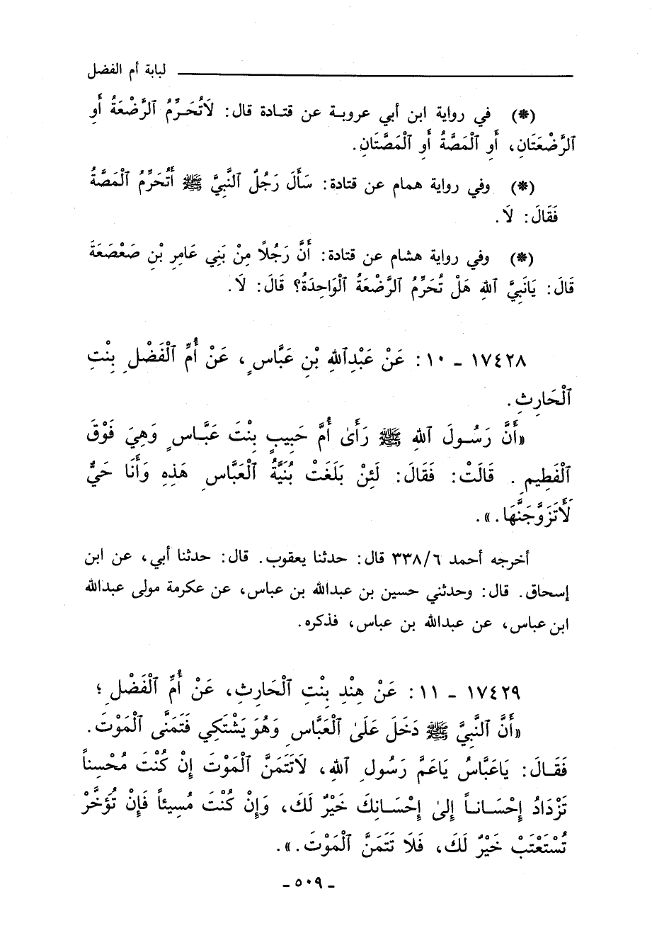أَنَّ رَسُولَ اللهِِ رَاى أم حَبِيبٍ بنْتَ عَبَّاسٍ وَهِيَ فَوْقَ الْفَطِيمِ. قَالَتْ: فَقَالَ: لَئِنْ بَلَغَتْ بُنَيَّةُ الْعَبَّاسِ هَذِهِ وَانَا حَيٌّ لاتَزَوَّجَنَّهَا.