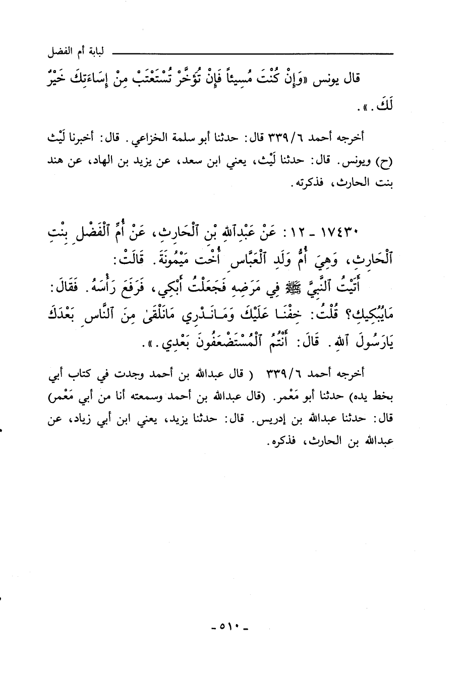 ١٧٤٣٠ - عَنْ عَبْدِ اللهِ بْنِ الْحَارِثِ، عَنْ أم الْفَضْلِ بنْتِ الْحَارِث، وَهِيَ أم وَلَدِ الْعَبَّاسِ اُخْتِ مَيْمُونَةَ. قَالَتْ: اتًيْتُ النَّبِيَّ صلى الله عليه وسلم فِي مَرَضِهِ فَجَعَلْتُ ابْكِي، فَرَفَعَ رَاْسَهُ. فَقَالَ: مَايُبُكِيكِ؟ قُلْتُ: خِفْنَا عَلَيْكَ وَمَانَدْرِي مَانَلْقَى مِنَ النَّاسِ بَعْدَكَ يَارَسُولَ اللهِِ، قال: انْتُمُ الْمُسْتَضْعَفُونَ بَعْدِي.