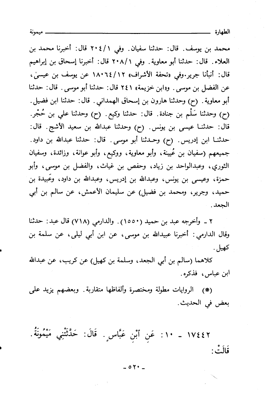 محمد بن يوسف، قال: حدثنا سفيان. وفي ١/ ٢٠٤ قال: أخبرنا محمد بن العلاء، قال: حدثنا أبو معاوية. وفي ١/ ٢٠٨ قال: أخبرنا إسحاق بن إبراهيم قال: أنبأنا جرير. وفي تحفة الاشراف ١٢/ ١٨٠٦٤ عن يوسف بن عيسى، عن الفضل بن موسى. و"ابن خزيمة" ٢٤١ قال: حدثنا أبو موسى، قال: حدثنا أبو معاوية (ح) وحدثنا هارون بن إسحاق الهمداني، قال: حدثنا ابن فضيل (ح) وحدثنا سَلْم بن جنادة، قال: حدثنا وكيع (ح) وحدثنا علي بن حُجْر، قال: حدثنا عيسى بن يونس (ح) وحدثنا عبد الله بن سعيد الاشج، قال: حدثنا ابن ادريس (ح) وحدثنا أبو موسى، قال: حدثنا عبد الله بن داود. جميعهم (سفيان بن عُيينة، وأبو معاوية، ووكيع، وأبو عوانة، وزائدة، وسفيان الثوري، وعبد الواحد بن زياد، وحفص بن غياث، والفضل بن موسى، وأبو حمزة، وعيسى بن يونس، وعبد الله بن ادريس، وعبد الله بن داود، وعَبيدة بن حميد، وجرير، ومحمد بن فضيل) عن سليمان الأعمش، عن سالم بن أبي الجعد.