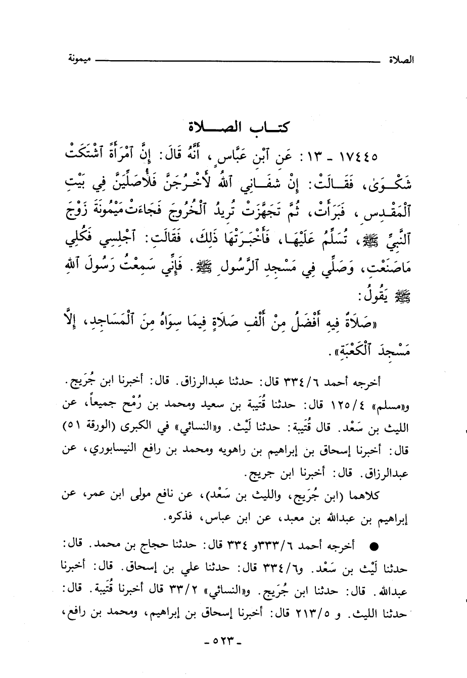 ١٧٤٤٥ - عَنِ ابْنِ عَبَّاسٍ، انَّهُ قَالَ: إِنَّ امْرَاةً اشْتَكَتْ شَكْوَى، فَقَالَتْ: إِنْ شفَانِي اللَّهُ لاخْرُجَنَّ فَلاصَلِّيَنَّ فِي بَيْتِ الْمَقْدِسِ، فَبَرَاتْ، ثُمَّ تَجَهَّزَتْ تُرِيدُ الْخُرُوجَ فَجَاءَتْ مَيْمُونَةَ زَوْجَ النَّبِيِّ صلى الله عليه وسلم، تُسَلِّمُ عَلَيْهَا، فَاخْبَرَتْهَا ذَالِكَ، فَقَالَتِ: اجْلِسِي فَكُلِي مَاصَنَعْتِ، وَصَلِّي فِي مَسْجِدِ الرَّسُولِ صلى الله عليه وسلم. فَإِنِّي سَمِعْتُ رَسُولَ اللهِِ صلى الله عليه وسلم يَقُولُ: