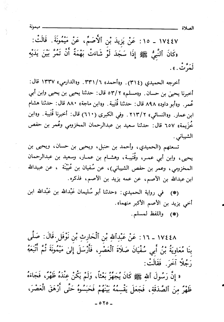 ١٧٤٤٨ - عَنْ عَبْدِ اللهِ بْنِ الْحَارِثِ بْنِ نَوْفَلٍ، قال: صَلَّى بِنَا مُعَاوِيَةُ بْنُ أبي سُفْيَانَ صَلاةَ الْعَصْرِ، فَارْسَلَ إِلى مَيْمُونَةَ ثُمَّ اتْبَعَهُ رَجُلاً اخَرَ. فَقَالَتْ: