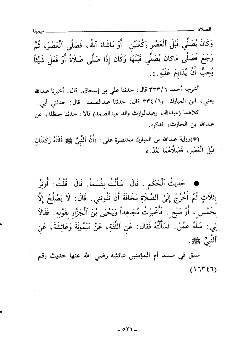 - حَدِيثُ الْحَكَمِ، قال: سَالْتُ مِقْسَمًا، قال: قُلْتُ: اوتِرُ بِثَلاثٍ ثُمَّ اخْرُجُ إِلَى الصَّلاةِ مَخَافَةَ أَنْ تَفُوتني، قال: لا يَصْلُحُ إِلَاّ بِخَمْسٍ، اوْ سَبْعٍ. فَاخْبَرْتُ مُجَاهِدًا وًيحْيىَ بْنَ الْجَزَّارِ بِقَوْلِهِ. فَقَالا لِي: سَلْهُ عَمَّنْ. فَسَالْتُهُ فَقَالَ: عَنِ الثِّقَّةِ، عَنْ مَيْمُونَةَ وَعَائِشَةَ، عَنِ النَّبِيَّ صلى الله عليه وسلم