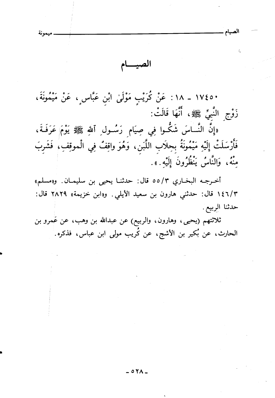 إِنًّ النَّاسَ شَكُّوا فِي صِيَامِ رَسُولِ اللهِ صلى الله عليه وسلم يَوْمَ عَرَفَةَ، فَارْسَلَتْ إِلَيْهِ مَيْمُونَةُ بِحِلابِ اللَّبَنِ، وَهُوَ واقِفٌ فِي الْموقِفِ، فَشَرِبَ مِنْهُ، وَالنَّاسُ يَنْظُرُونَ إِلَيْهِ.