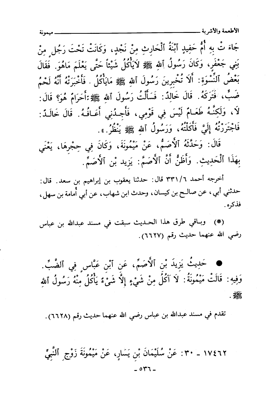 - حَدِيثُ يَزِيدَ بْنِ الاصَمِّ، عَن ابْنِ عَبَّاسٍ فِي الضَّبِّ. وَفِيهِ: قَالَتْ مَيْمُونَةُ: لا اكُلُ مِنْ شَيْءٍ إِلَاّ شَىْءٌ يَاكُلُ مِنْهُ رَسُولُ اللهِِصلى الله عليه وسلم.