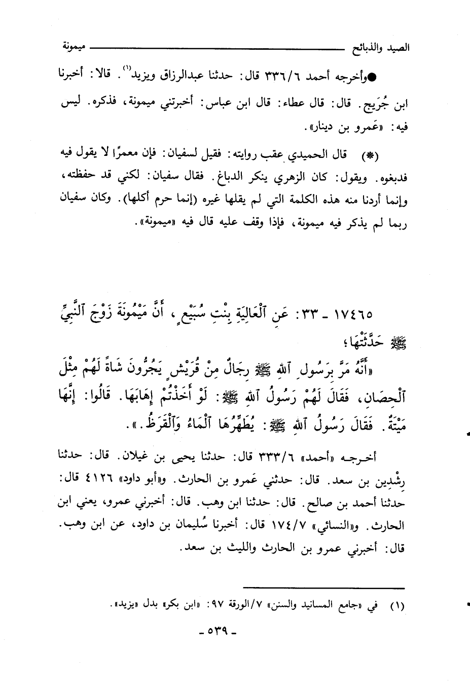 - قال الحميدي عقب روايته: فقيل لسفيان: فان معمرًا لا يقول فيه فدبغوه. ويقول: كان الزهري ينكر الدباغ. فقال سفيان: لكني قد حفظته، وانما اردنا منه هذه الكلمة التي لم يقلها غيره (انما حرم اكلها). وكان سفيان ربما لم يذكر فيه ميمونة، فاذا وقف عليه قال فيه ميمونة.