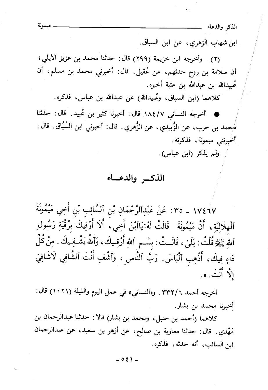 ١٧٤٦٧ - عَنْ عَبْدِ الرَّحْمانِ بْنِ السَّائِبِ بْنِ اخِي مَيْمُونَةَ الْهِلالِيَّةِ، أَنَّ مَيْمُونَةَ قَالَتْ لَهُ: يَا ابْنَ اخِي، الا ارْقِيكَ بِرُقْيَةِ رَسُولِ اللهِ صلى الله عليه وسلم قًلْتُ: بَلَى، قَالَتْ: بِسْمِ اللهِ ارْقِيكَ، وَاللَّهُ يَشْفِيكَ. مِنْ كُلِّ دَاءٍ فِيكَ، اذْهِبِ الْبَاسَ. رَبَّ النَّاسِ، وَاشْفِ انْتَ الشَّافِي لاشَافِيَ إِلَاّ انْتَ.