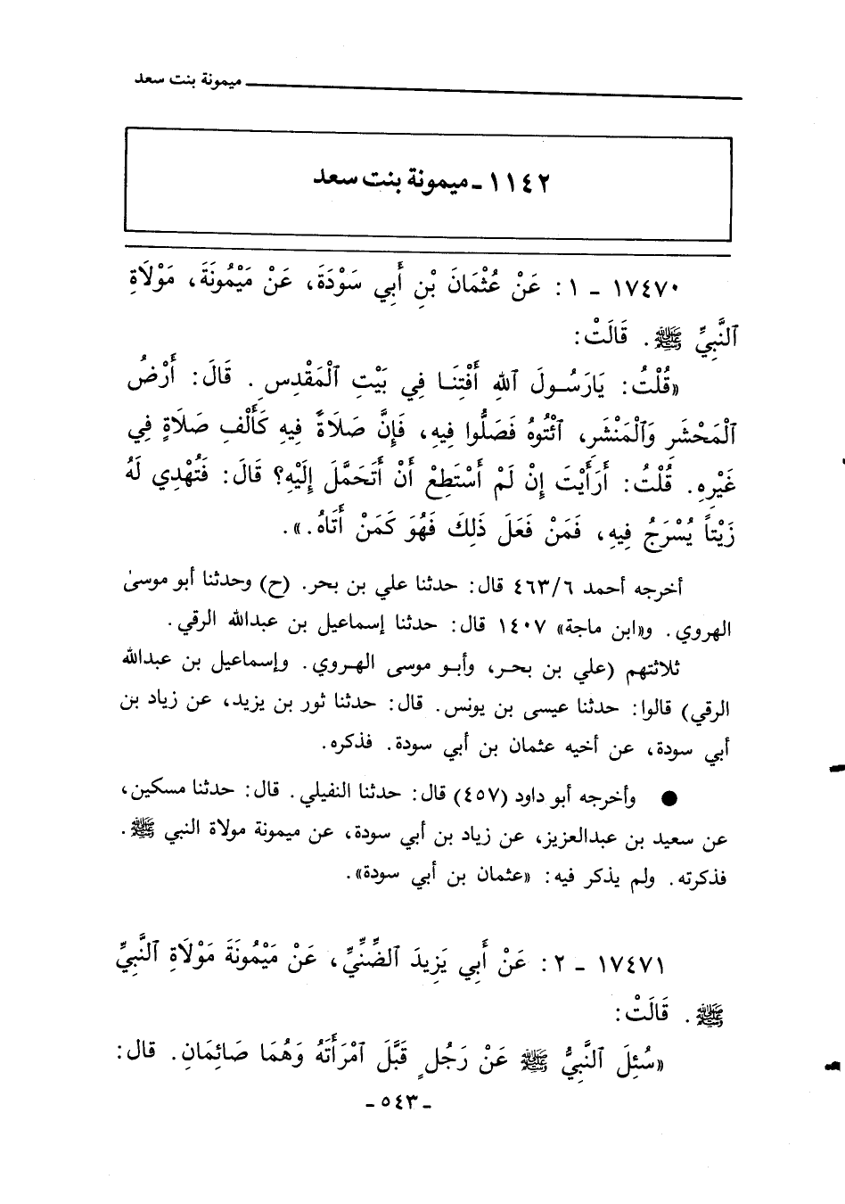 ١٧٤٧٠ - عَنْ عُثْمَانَ بْنِ أبي سَوْدَةَ، عَنْ مَيْمُونَةَ، مَوْلاةِ النَّبِيِّ صلى الله عليه وسلم. قَالَتْ: