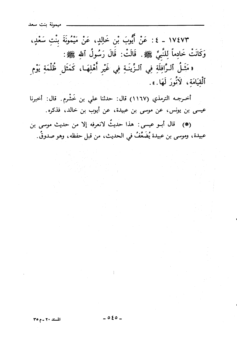 - قال أبو عيسى: هذا حديثٌ لانعرفه الا من حديث موسى بن عبيدة، وموسى بن عبيدة يُضَعَّفُ في الحديث، من قبل حفظه، وهو صدوق.