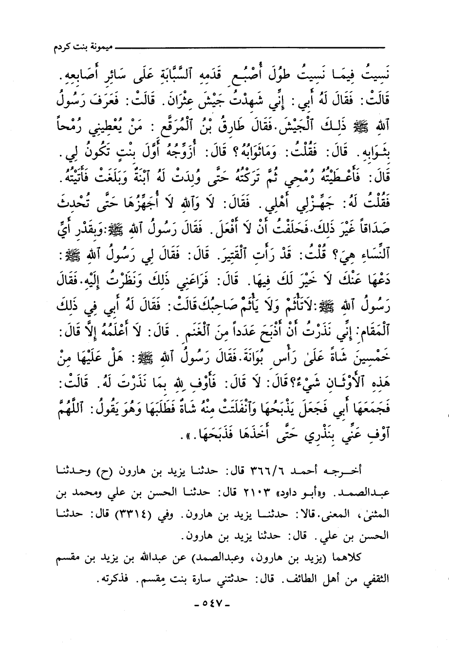 نَسِيتُ فِيمَا نَسِيتُ طُولَ اُصْبُعِ قَدَمِهِ السَّبَّابَةِ عَلَى سَائِرِ اصَابِعِهِ. قَالَتْ: فَقَالَ لَهُ ابِى: إِنِّى شَهِدْتُ جَيْشَ عِثْرَانَ. قَالَتْ: فَعَرَفَ رَسُولُ اللهِِ صلى الله عليه وسلم ذَالِكَ الْجَيْشَ. فَقَالَ طَارِقُ بْنُ الْمُرَقَّعِ: مَنْ يُعْطِينِى رُمْحًا بِثَوَابِهِ، قال: فَقُلْتُ: وَمَا ثَوَابُهُ؟ قَالَ: اُزَوِّجُهُ اوَّلَ بِنْتٍ تَكُونُ لِى، قال: فَاعْطَيْتُهُ رُمْحِى ثُمَّ تَرَكْتُهُ حَتَّى وُلِدَتْ لَهُ ابْنَةٌ وَبَلَغَتْ فَاتَيْتُهُ. فَقُلْتُ لَهُ: جَهِّزْ لِى اهْلِى. فَقَالَ: لا وَاللَّهِ لا اُجَهِّزُهَا حَتَّى تُحْدِثَ صَدَاقًا غَيْرَ ذَالِكَ. فَحَلَفْتُ أَنْ لا افْعَلَ. فَقَالَ رَسُولُ اللهِِ صلى الله عليه وسلم: وَبِقَدْرِ اىِّ النِّسَاءِ هِىَ؟ قُلْتُ: قَدْ رَاتِ الْقَتِيرَ، قال: فَقَالَ لِى رَسُولُ اللهِِ صلى الله عليه وسلم: دَعْهَا عَنْكَ لا خَيْرَ لَكَ فِيهَا، قال: فَرَاعَنِى ذَالِكَ وَنَظَرْتُ إِلَيْهِ. فَقَالَ رَسُولُ اللهِِ صلى الله عليه وسلم: لا تَاْثَمُ وَلا يَاْثَمُ صَاحِبُكَ. قَالَتْ: فَقَالَ لَهُ ابِى فِى ذَالِكَ الْمَقَامِ: إِنِّى نَذَرْتُ أَنْ اذْبَحَ عَدَدًا مِنَ الْغَنَمِ، قال: لا اعْلَمُهُ إِلَاّ قَالَ: خَمْسِينَ شَاةً عَلَى رَاْسِ بُوَانَةَ. فَقَالَ رَسُولُ اللهِِ صلى الله عليه وسلم