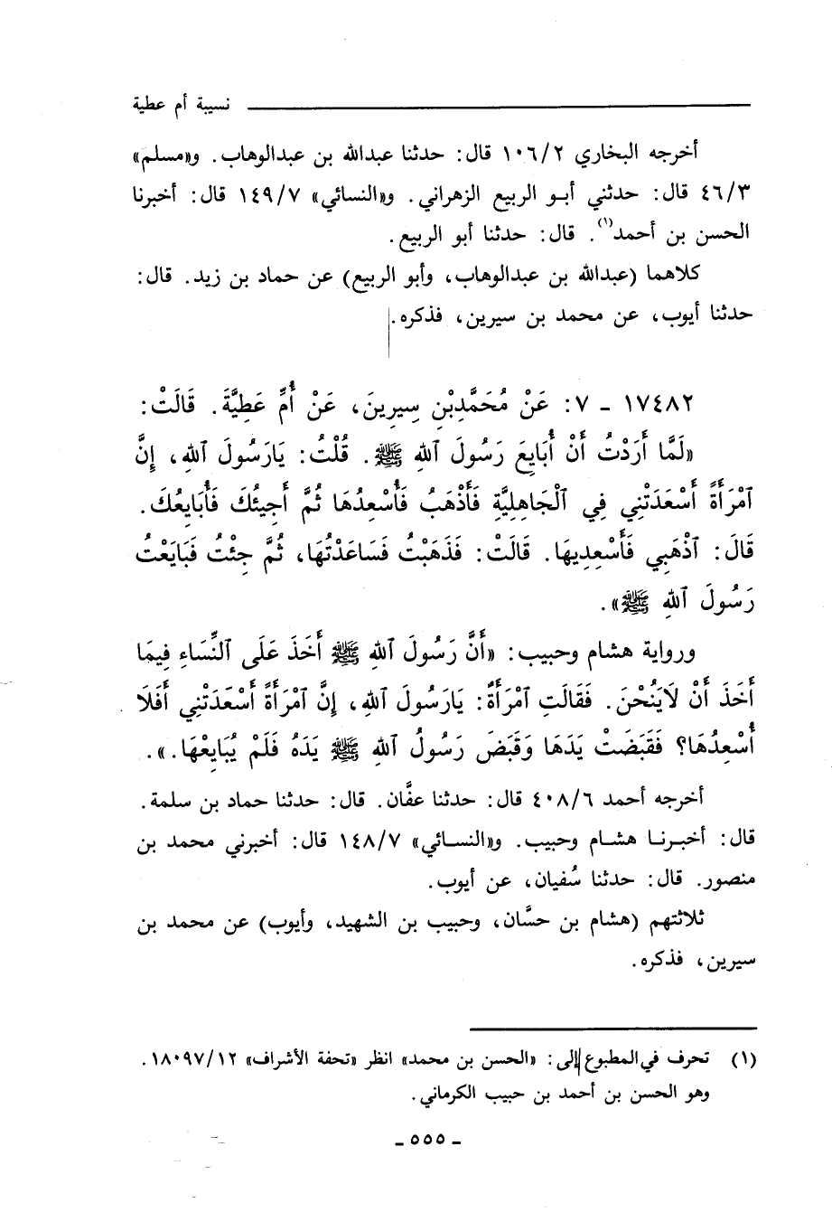 ورواية هشام وحبيب: أَنَّ رَسُولَ اللهِِ صلى الله عليه وسلم اخَذَ عَلَى النِّسَاءِ فِيمَا اخَذَ أَنْ لايَنُحْنَ. فَقَالَتِ امْرَاةٌ: يَارَسُولَ اللهِِ، إِنَّ امْرَاةً اسْعَدَتْنِي افَلا اُسْعِدُهَا؟ فَقَبَضَتْ يَدَهَا وَقَبَضَ رَسُولُ اللهِِ صلى الله عليه وسلم يَدَهُ فَلَمْ يُبَايِعْهَا.