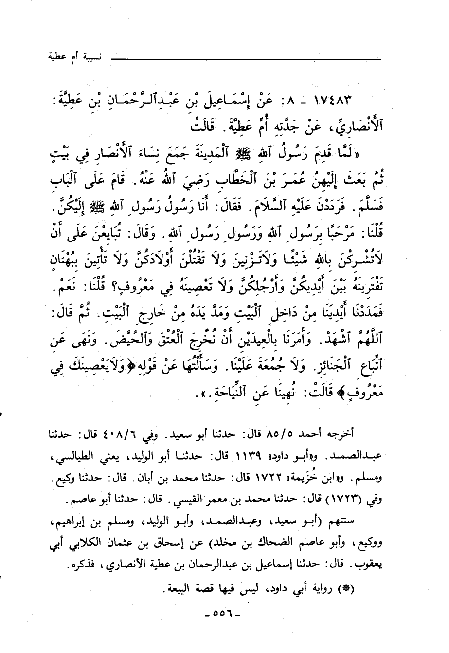 لَمَّا قَدِمَ رَسُولُ اللهِِ صلى الله عليه وسلم الْمَدِينَةَ جَمَعَ نِسَاءَ الانْصَارِ فِي بَيْتٍ ثُمَّ بَعَثَ إِلَيْهِنَ عُمَرَ بْنَ الْخَطَّابِ رَضِيَ اللَّهُ عَنْهُ. قَامَ عَلَى الْبَاب فَسَلمَ. فَرَدَدْنَ عَلَيْهِ السًلامَ. فَقَالَ: انَا رَسُولُ رَسُولِ اللهِ صلى الله عليه وسلم إِلَيْكُنَّ. َ قُلْنَا: مَرْحَبًا بِرَسُولِ اللهِ وَرَسُولِ رَسُولِ اللهِ. وَقَالَ: تُبَايِعْنَ عَلَى أَنْ لا تُشْرِكْنَ بِاللهِ شَيْئًا وَلاتَزنِينَ وَلا تَقْتُلْنَ اوْلادَكُنَّ وَلا تَاْتِينَ بِبُهْتَانٍ تَفْتَرِينَهُ بَيْنَ ايْدِيكُنَ وَارْجُلِكُنً وَلا تَعْصِينَهُ فِي مَعْرُوفٍ؟ قُلْنَا: نَعَمْ. فَمَدَدْنَا ايْدِيَنَا مِنْ دَاخِلِ الْبَيْتِ وَمَدً يَدَهُ مِنْ خَارِجِ الْبَيْتِ. ثُمَّ قَالَ: اللَّهُمَّ اشْهَدْ. وَامَرَنَا بِالْعِيدَيْنِ أَنْ نُخْرِجَ الْعُتْقَ وَالحُيَّضَ. وَنَهَى عَنِ اتِّبَاعِ الْجَنَائِزِ. وَلا جُمُعَةَ عَلَيْنَا. وَسَالْتُهَا عَنْ قَوْلِهِ: (وَلايَعْصِينَكَ فِي مَعْرُوفٍ) قَالَتْ: نُهِينَا عَنِ النَيَاحَةِ.