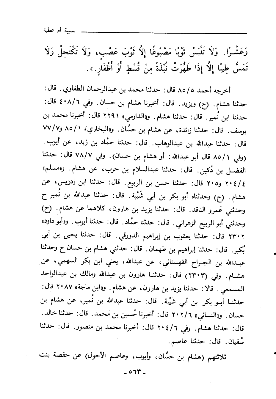 أخرجه أحمد ٥/ ٨٥ قال: حدثنا محمد بن عبد الرحمن الطفاوي، قال: حدثنا هشام (ح) ويزيد، قال: أخبرنا هشام بن حسان. وفي ٦/ ٤٥٨ قال: حدثنا ابن نُمير، قال: حدثنا هشام. و"الدارِمِي" ٢٢٩١ قال: أخبرنا محمد بن يوسف، قال: حدثنا زائدة، عن هشام بن حسَّان. و"البُخَارِي" ١/ ٨٥ و ٧/ ٧٧ قال: حدثنا عبد الله بن عبد الوهاب، قال: حدثنا حمَّاد بن زيد، عن أيوب (وفي ١/ ٨٥ قال أبو عبد الله: او هشام بن حسان). وفي ٧٨/ ٧ قال: حدثنا الفضل بن دُكين، قال: حدثنا عبد السلام بن حرب، عن هشام. و"مسلم" ٤/ ٢٠٤ و ٢٠٥ قال: حدثنا حسن بن الربيع، قال: حدثنا ابن ادريس، عن هشام (ح) وحدثناه أبو بكر بن أبي شَيْبة، قال: حدثنا عبد الله بن نمير ح وحدثني عَمرو الناقد، قال: حدثنا يزيد بن هارون، كلاهما عن هشام (ح) وحدثني أبو الربيع الزهراني، قال: حدثنا حمَّاد، قال: حدثنا أيوب. و"أبو داود" ٢٣٠٢ قال: حدثنا يعقوب بن إبراهيم الدورقي، قال: حدثنا يحيى بن أبي بُكير، قال: حدثنا إبراهيم بن طهمان، قال: حدثني هشام بن حسان ح وحدثنا عَبد اللهِ بن الجراح القهستاني، عن عَبد اللهِ، يعني ابن بكر السهمي، عن هشام. وفي (٢٣٠٣) قال: حدثنا هارون بن عبد الله ومالك بن عبد الواحد المسمعي. قالا: حدثنا يزيد بن هارون، عن هشام. و"ابن ماجة" ٢٠٨٧ قال: حدثنا أبو بكر بن أبي شَيْبة، قال: حدثنا عبد الله بن نمير، عن هشام بن حسان. و"النَّسائي" ٦/ ٢٠٢ قال: أخبرنا حُسين بن محمد، قال: