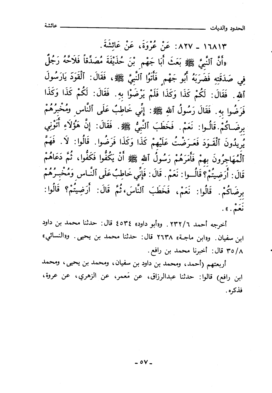 انَّ النَّبِىَّ صلى الله عليه وسلم بَعَثَ ابَا جَهْمِ بْنَ حُذَيْفَةَ مُصَدِّقا فَلاحَّهُ رَجُلٌ فِى صَدَقَتِهِ فَضَرَبَهُ أبو جَهْمٍ فَاتَوُا النَّبِىَّ صلى الله عليه وسلم، فَقَالَ: الْقَوَدُ يَا رَسُولَ اللهِ. فَقَالَ: لَكُمْ كَذَا وَكَذَا. فَلَمْ يَرْضَوْا بِهِ. فَقَالَ: لَكُمْ كَذَا وَكَذَا. فَرَضُوا بِهِ. فَقَالَ رَسُولُ اللهِ صلى الله عليه وسلم: انِّى خَاطِبٌ عَلَى النَّاسِ وَمُخْبِرُهُمْ بِرِضَاكُمْ. قَالُوا: نَعَمْ. فَخَطَبَ النَّبِىُّ صلى الله عليه وسلم فَقَالَ: انَّ هَؤُلاءِ اتَوْنِى يُرِيدُونَ الْقَوَدَ فَعَرَضْتُ عَلَيْهِمْ كَذَا وَكَذَا فَرَضُوا. قَالُوا: لا. فَهَمَّ الْمُهَاجِرُونَ بِهِمْ فَامَرَهُمْ رَسُولُ اللهِ صلى الله عليه وسلم انْ يَكُفُّوا فَكَفُّوا، ثُمَّ دَعَاهُمْ قَالَ: ارَضِيتُمْ؟ قَالُوا: نَعَمْ. قَالَ: فَانِّى خَاطِبٌ عَلَى النَّاسِ وَمُخْبِرُهُمْ بِرِضَاكُمْ. قَالُوا: نَعَمْ. فَخَطَبَ النَّاسَ ثُمَّ قَالَ: ارَضِيتُمْ؟ قَالُوا: نَعَمْ.