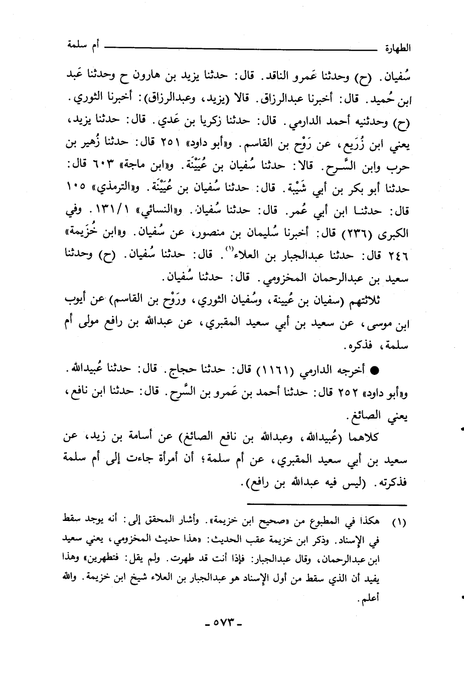 سُفيان (ح) وحدثنا عَمرو الناقد، قال: حدثنا يزيد بن هارون ح وحدثنا عَبد بن حُميد، قال: أخبرنا عبد الرزاق. قالا (يزيد، وعبد الرزاق): أخبرنا الثوري (ح) وحدثنيه أحمد الدارمي، قال: حدثنا زكريا بن عَدي، قال: حدثنا يزيد، يعني ابن زُرَيع، عن رَوْح بن القاسم. و"أبو داود" ٢٥١ قال: حدثنا زُهير بن حرب وابن السَّرح. قالا: حدثنا سُفيان بن عُيَيْنَة. و"ابن ماجة" ٦٠٣ قال: حدثنا أبو بكر بن أبي شَيْبة، قال: حدثنا سُفيان بن عًيَيْنَة. و"التِّرمِذي" ١٠٥ قال: حدثنا ابن أبي عُمر، قال: حدثنا سُفيان. و"النَّسائي" ١/ ١٣١. وفي "الكبرى" (٢٣٦) قال: أخبرنا سليمان بن منصور، عن سُفيان. و"ابن خزيمة" ٢٤٦ قال: حدثنا عبد الجبار بن العلاء، قال: حدثنا سُفيان (ح) وحدثنا سعيد بن عبد الرحمن المخزومي، قال: حدثنا سُفيان.