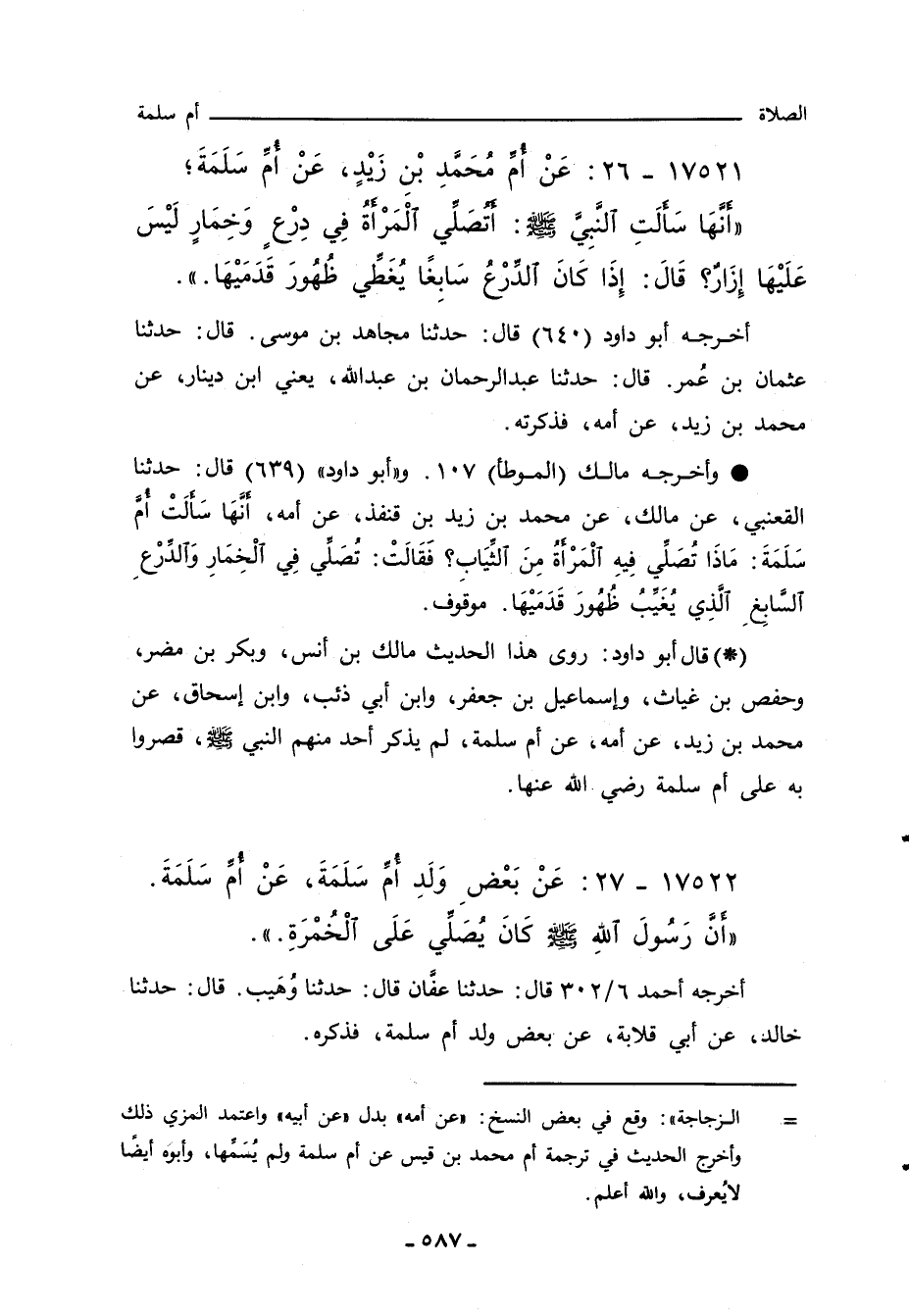 - قال أبو داود: روى هذا الحديث مالك بن انس، وبكر بن مضر، وحفص بن غياث، وإسماعيل بن جعفر، وابن أبي ذئب، وابن إسحاق، عن محمد بن زيد، عن أمه، عن أم سلمة، لم يذكر احد منهم النبي صلى الله عليه وسلم، قصروا به على أم سلمة رضي الله عنها.