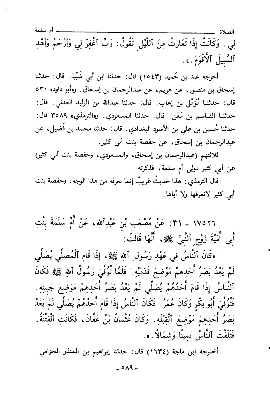 أخرجه عبد بن حُميد (٥٤٣ ا) قال: حدثنا ابن أبي شَيْبة، قال: حدثنا إسحاق بن منصور، عن هريم، عن عبد الرحمن بن إسحاق. و"أبو داود" ٥٣٠ قال: حدثنا مُؤَمَّل بن اهاب، قال: حدثنا عَبد اللهِ بن الوليد العدني، قال: حدثنا القاسم بن مَعْن، قال: حدثنا المسعودي. و"التِّرمِذي" ٣٥٨٩ قال: حدثنا حُسين بن علي بن الاسود البغدادي، قال: حدثنا محمد بن فضيل، عن عبد الرحمن بن إسحاق، عن حفصة بنت أبي كثير.