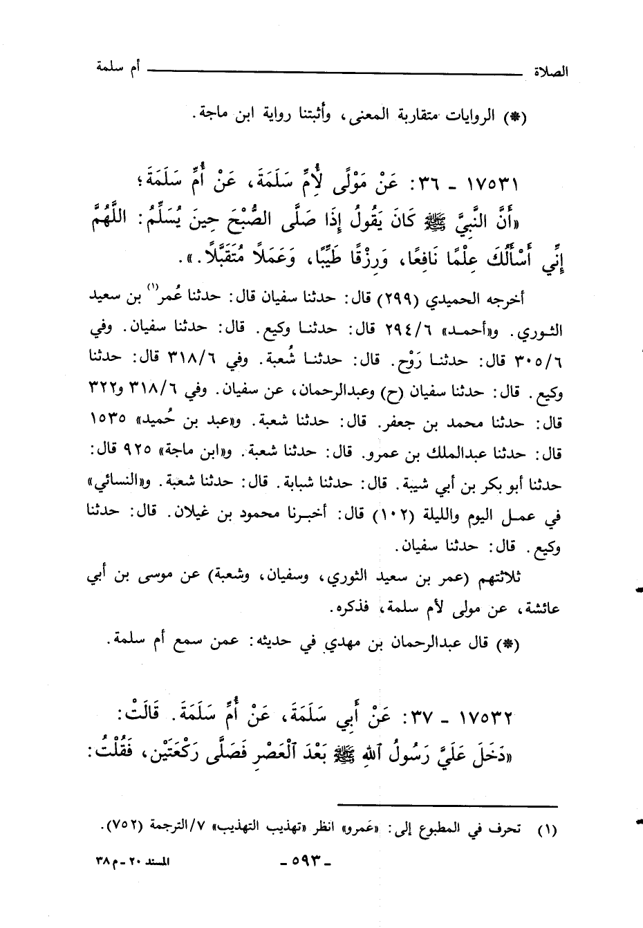 أخرجه الحميدي (٢٩٩) قال: حدثنا سفيان قال: حدثنا عُمر بن سعيد الثوري. و"أحمد" ٦/ ٢٩٤ قال: حدثنا وكيع، قال: حدثنا سفيان. وفي ٦/ ٣٠٥ قال: حدثنا رَوْح، قال: حدثنا شُعبة. وفي ٦/ ٣١٨ قال: حدثنا وكيع، قال: حدثنا سفيان (ح) وعبد الرحمن، عن سفيان. وفي ٦/ ٣١٨ و ٣٢٢ قال: حدثنا محمد بن جعفر، قال: حدثنا شعبة. وعبد بن حُميد ١٥٣٥ قال: حدثنا عبد الملك بن عمرو، قال: حدثنا شعبة. و"ابن ماجة" ٩٢٥ قال: حدثنا أبو بكر بن أبي شيبة، قال: حدثنا شبابة، قال: حدثنا شعبة. و"النَّسائي" في عمل اليوم والليلة (١٠٢) قال: أخبرنا محمود بن غيلان، قال: حدثنا وكيع، قال: حدثنا سفيان. ثلاثتهم (عمر بن سعيد الثوري، وسفيان، وشعبة) عن موسى بن أبي عائشة، عن مولى لام سلمة، فذكره.