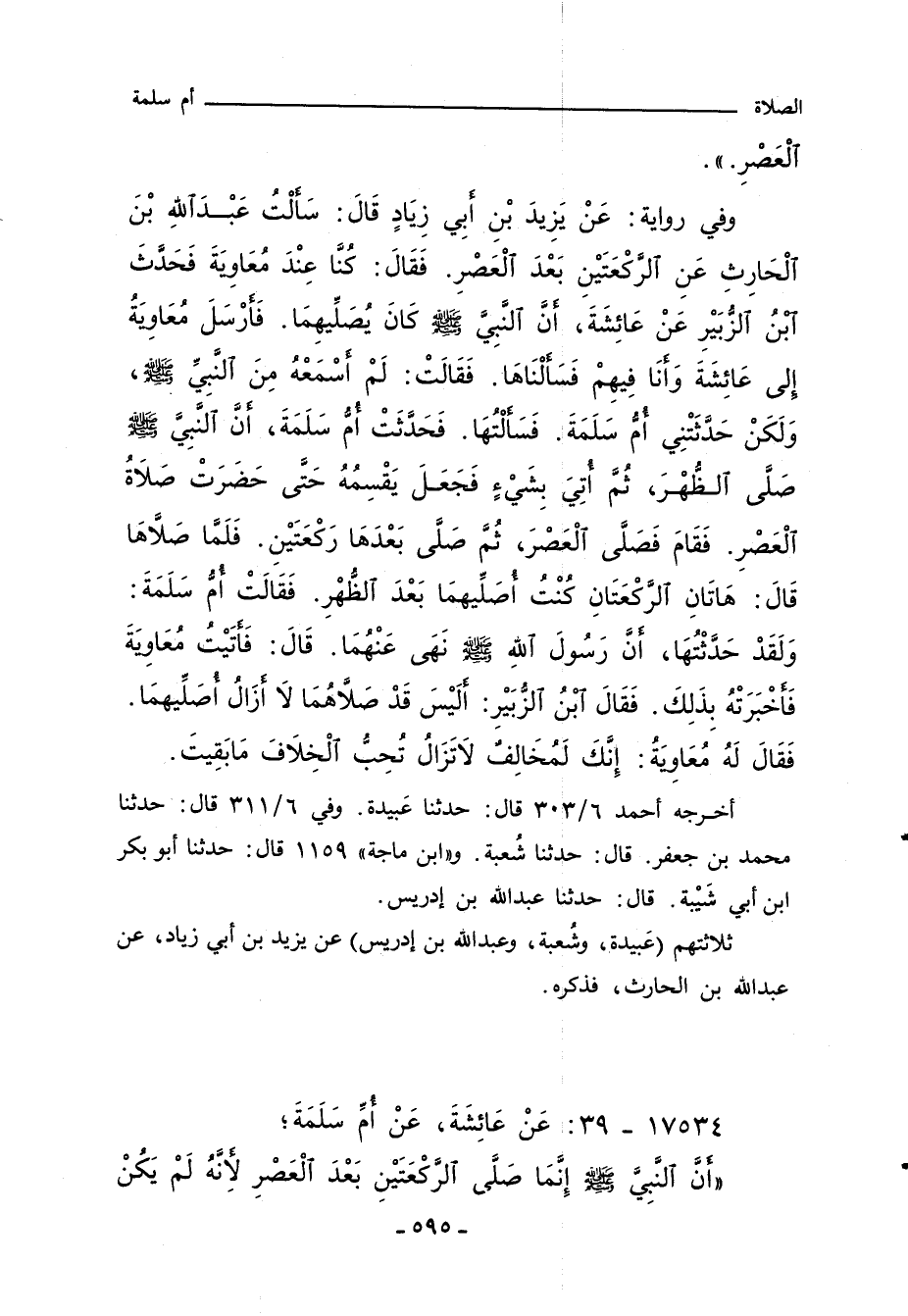 وفي رواية: عَنْ يَزِيدَ بْنِ أبي زِيَادٍ قَالَ: سَالْتُ عَبْدِ اللهِ بْنَ الحَارِثِ عَنِ الرَّكْعَتَيْنِ بَعْدَ الْعَصْرِ. فَقَالَ: كُنَّا عِنْدَ مُعَاوِيةَ فَحَدَّثَ ابنُ الزُبَيْرِ عَنْ عَائِشَةَ، أَنَّ النَّبِيَّ صلى الله عليه وسلم يُصلِّيهِمَا. فَارْسَلَ مُعَاوِيَةُ إِلى عَائِشَةَ وَانَا فِيهِمْ فَسَالْنَاهَا. فَقَالَتْ: لَمْ اسْمَعْهُ مِنَ النَّبِيِّ صلى الله عليه وسلم، وَلَكَنْ حَدَّثَتْنِي أم سَلَمَةَ. فَسَالْتُهَا. فَحَدَّثَتْ أم سَلَمَةَ، انَّ النَّبِيَّ صلى الله عليه وسلم صَلَّى الظُّهْرَ، ثُمَّ اتِي، بِشَيْءٍ فَجَعَلَ يَقْسِمُهُ حَتَّى حَضَرَتْ صَلاةُ الْعَصْرِ. فَقَامَ فَصَلَّى الْعَصْرَ، ثُمَّ صَلَّى بَعْدَهَا رَكْعَتَيْنِ. فَلَمَّا صَلاهَا قَالَ: هَاتَانِ الرَّكْعَتَانِ كُنْتُ اُصَلِّيهمَا بَعْدَ الظُّهْرِ. فَقَالَتْ أم سَلَمَةَ: وَلَقَدْ حَدَّثْتُهَا، أَنَّ رَسُولَ اللهِ صلى الله عليه وسلم نَهَى عَنْهُمَا، قال: فَاتَيْتُ مُعَاوِيَةَ فَاخْبَرَتْهُ بِذَالِكَ. فَقَالَ ابْنُ الزُّبَيْرِ: الَيْسَ قَدْ صَلَاّهُمَا لا ازَالُ اُصَلِّيهمَا. فَقَالَ لَهُ مُعَاوِيةُ: إِنَّكَ لَمُخَالِفٌ لاتَزَالُ تُحِبُّ الْخِلافَ مَابَقِيتَ.